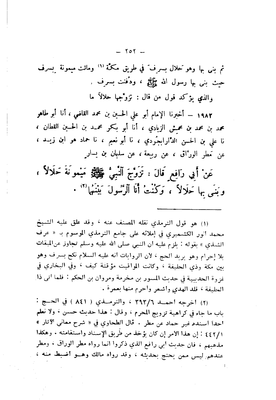 1981 - أَخْبَرَنَا الإِمَامُ أَبُو عَلِيٍّ الْحُسَيْنُ بْنُ مُحَمَّدٍ الْقَاضِي، أَنا أَبُو طَاهِرٍ مُحَمَّدُ بْنُ مُحَمَّدِ بْنِ مَحْمَشٍ الزِّيَادِيُّ، أَنا أَبُو بَكْرٍ مُحَمَّدُ بْنُ الْحُسَيْنِ الْقَطَّانُ، نَا عَلِيُّ بْنُ الْحَسَنِ الدَّارَابَجُرْدِيُّ، نَا أَبُو نُعَيْمٍ، نَا حَمَّادٌ، هُوَ ابْنُ زَيْدٍ، عَنْ مَطَرٍ الْوَرَّاقِ، عَنْ رَبِيعَةَ، عَنْ سُلَيْمَانَ بْنِ يَسَارٍ، عَنْ أَبِي رَافِعٍ، قَالَ: «تَزَوَّجَ النَّبِيُّ صَلَّى اللهُ عَلَيْهِ وَسَلَّمَ مَيْمُونَةَ حَلالا، وَبَنَى بِهَا حَلالا، وَكُنْتُ أَنَا الرَّسُولُ بَيْنَهُمَا».