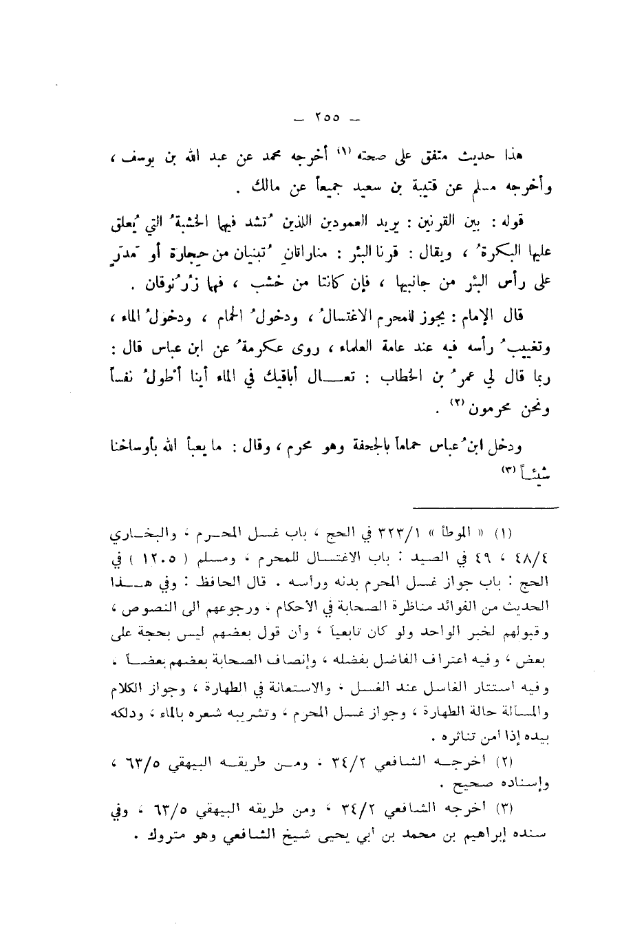 قَالَ الإِمَامُ: يَجُوزُ لِلْمُحْرِمِ الاغْتِسَالُ، وَدُخُولُ الْحَمَّامِ، وَدُخُولِ الْمَاءِ، وَتَغْيِيبُ رَأْسِهِ فِيهِ عِنْدَ عَامَّةِ الْعُلَمَاءِ، رَوَى عِكْرِمَةُ، عَنِ ابْنِ عَبَّاسٍ، قَالَ: رُبَّمَا قَالَ لِي عُمَرُ بْنُ الْخَطَّابِ: تَعَالَ أُبَاقِيكَ فِي الْمَاءِ أَيُّنَا أَطْوَلُ نَفَسًا، وَنَحْنُ مُحْرِمُونَ.