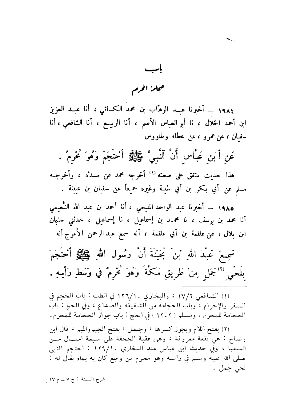 1983 - أَخْبَرَنَا عَبْدُ الْوَهَّابِ بْنُ مُحَمَّدٍ الْكِسَائِيُّ، أَنا عَبْدُ الْعَزِيزِ بْنُ أَحْمَدَ الْخَلالُ، نَا أَبُو الْعَبَّاسِ الْأَصَمُّ، أَنا الرَّبِيعُ، أَنا الشَّافِعِيُّ، أَنا سُفْيَانُ، عَنْ عَمْرٍو، عَنْ عَطَاءٍ، وَطَاوُسٍ، عَنِ ابْنِ عَبَّاسٍ، أَنّ النَّبِيَّ صَلَّى اللهُ عَلَيْهِ وَسَلَّمَ «احْتَجَمَ وَهُوَ مُحْرِمٌ».