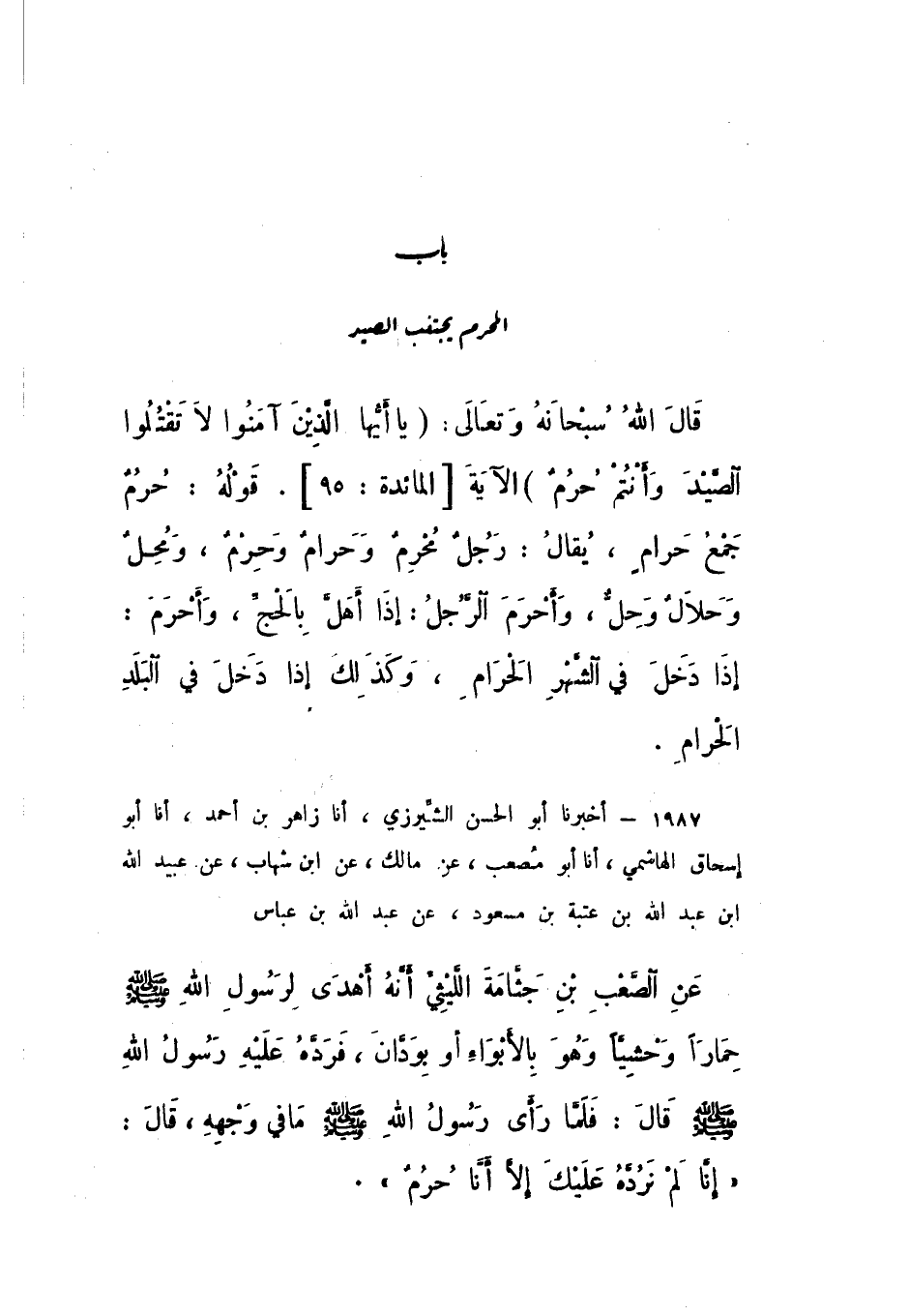 1986 - أَخْبَرَنَا أَبُو الْحَسَنِ الشِّيرَزِيُّ، أَنا زَاهِرُ بْنُ أَحْمَدَ، أَنا أَبُو إِسْحَاقَ الْهَاشِمِيُّ، أَنا أَبُو مُصْعَبٍ، عَنْ مَالِكٍ، عَنِ ابْنِ شِهَابٍ، عَنْ عُبَيْدِ اللَّهِ بْنِ عَبْدِ اللَّهِ بْنِ عُتْبَةَ بْنِ مَسْعُودٍ، عَنْ عَبْدِ اللَّهِ بْنِ عَبَّاسٍ، عَنِ الصَّعْبِ بْنِ جَثَّامَةَ اللَّيْثِيِّ، أَنَّهُ أَهْدَى لِرَسُولِ اللَّهِ صَلَّى اللهُ عَلَيْهِ وَسَلَّمَ حِمَارًا وَحْشِيًّا وَهُوَ بِالْأَبْوَاءِ، أَوْ بِوَدَّانَ، فَرَدَّهُ عَلَيْهِ رَسُولُ اللَّهِ صَلَّى اللهُ عَلَيْهِ وَسَلَّمَ، قَالَ: فَلَمَّا رَأَى رَسُولُ اللَّهِ صَلَّى اللهُ عَلَيْهِ وَسَلَّمَ مَا فِي وَجْهِهِ، قَالَ: «إِنَّا لَمْ نَرُدَّهُ عَلَيْكَ إِلا أَنَّا حُرُمٌ».