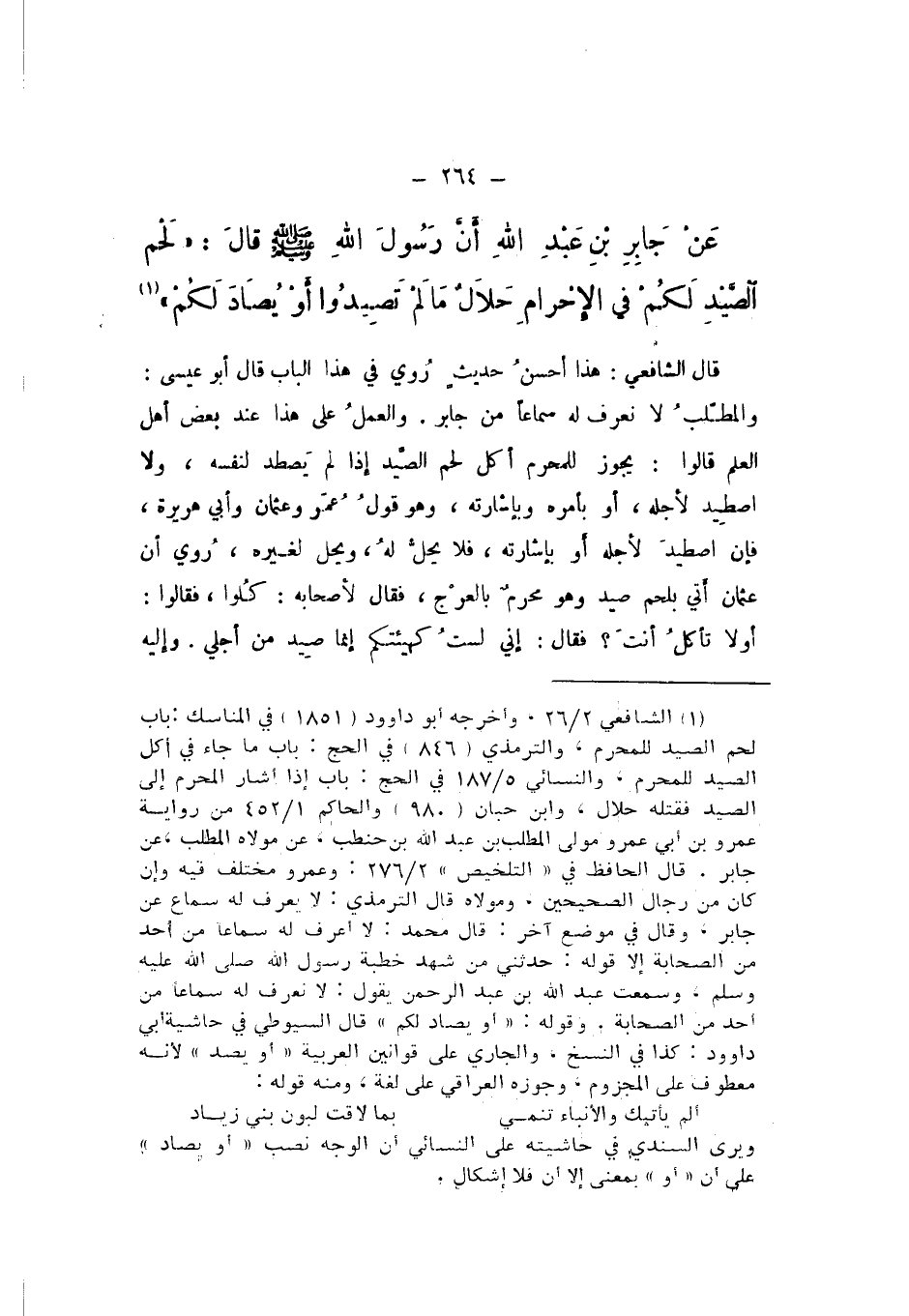 عَنْ جَابِرِ بْنِ عَبْدِ اللَّهِ، أَنّ رَسُولِ اللَّهِ صَلَّى اللهُ عَلَيْهِ وَسَلَّمَ، قَالَ: «لَحْمُ الصَّيْدِ لَكُمْ فِي الإِحْرَامِ حَلالٌ مَا لَمْ تَصِيدُوا، أَوْ يُصَادَ لَكُمْ».