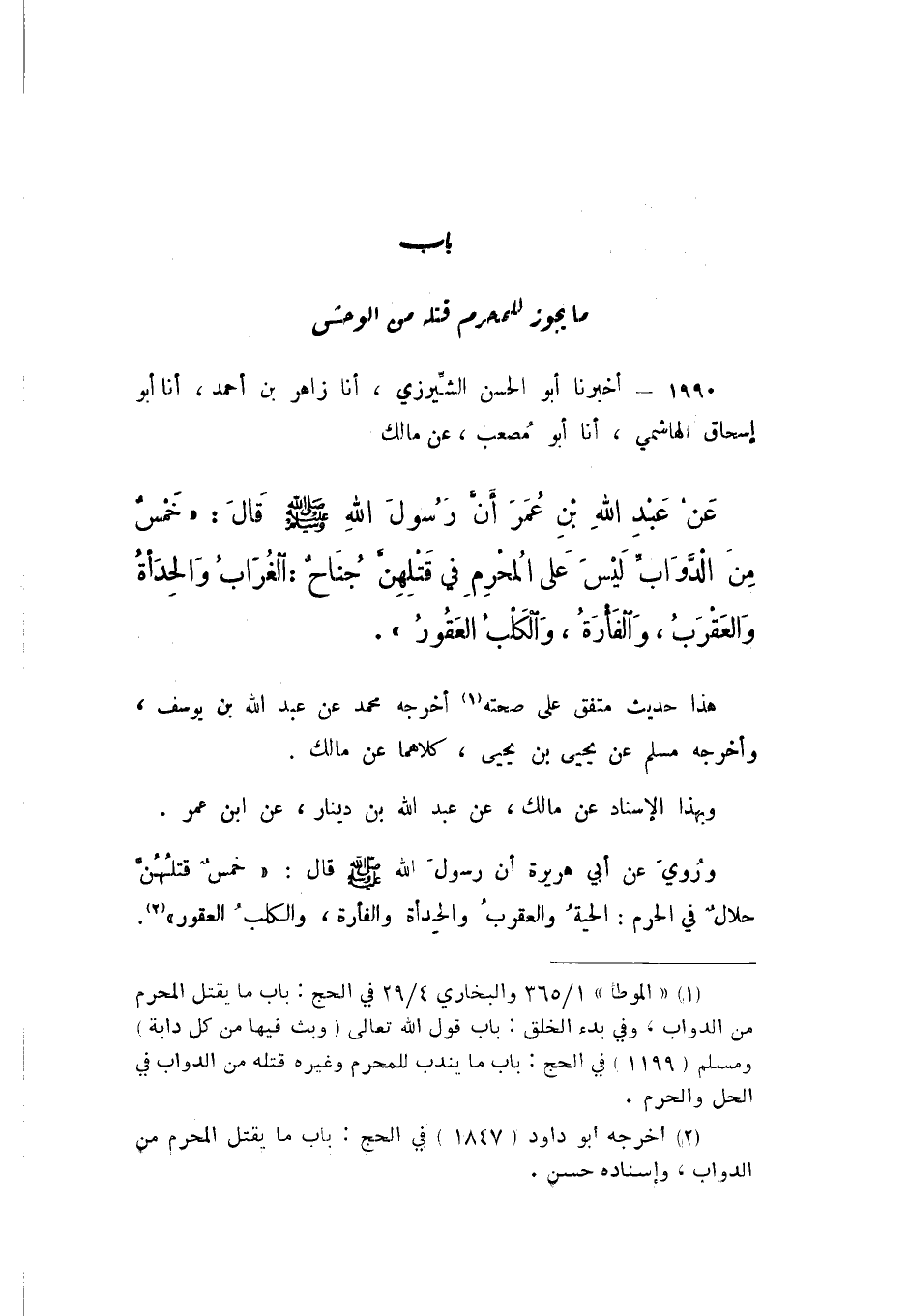 1990 - أَخْبَرَنَا أَبُو الْحَسَنِ الشِّيرَزِيُّ، أَنا زَاهِرُ بْنُ أَحْمَدَ، أَنا أَبُو إِسْحَاقَ الْهَاشِمِيُّ، أَنا أَبُو مُصْعَبٍ، عَنْ مَالِكٍ، عَنْ عَبْدِ اللَّهِ بْنِ عُمَرَ، أَنّ رَسُولَ اللَّهِ صَلَّى اللهُ عَلَيْهِ وَسَلَّمَ، قَالَ: " خَمْسٌ مِنَ الدَّوَابِّ لَيْسَ عَلَى الْمُحْرِمِ فِي قَتْلِهِنَّ جُنَاحٌ: الْغُرَابُ، والْحِدَأَةُ، وَالْعَقْرَبُ، وَالْفَأْرَةُ، وَالْكَلْبُ الْعَقُورُ ".