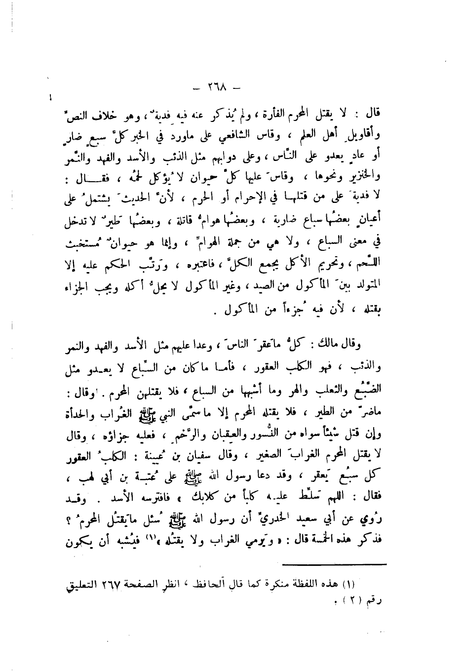وَقَالَ: مَا ضَرَّ مِنَ الطَّيْرِ، فَلا يَقْتُلُهُ الْمُحْرِمُ إِلا مَا سَمَّى النَّبِيُّ صَلَّى اللهُ عَلَيْهِ وَسَلَّمَ الْغُرَابَ، وَالْحِدَأَةَ، وَإِنْ قَتَلَ شَيْئًا سِوَاهُ مِنَ النُّسُورِ، وَالْعِقْبَانِ، وَالرَّخْمِ، فَعَلَيْهِ جَزَاؤُهُ، وَقَالَ لَا يَقْتُلُ الْمُحْرِمُ الْغُرَابَ الصَّغِيرَ، وَقَالَ سُفْيَانُ بْنُ عُيَيْنَةَ: الْكَلْبُ الْعَقُورُ كُلُّ سَبُعٍ يَعْقِرُ، وَقَدْ دَعَا رَسُولُ اللَّهِ صَلَّى اللهُ عَلَيْهِ وَسَلَّمَ عَلَى عُتْبَةَ بْنِ أَبِي لَهَبٍ، فَقَالَ: «اللَّهُمَّ سَلِّطْ عَلَيْهِ كَلْبًا مِنْ كِلابِكَ»، فَافْتَرَسَهُ الْأَسَدُ.