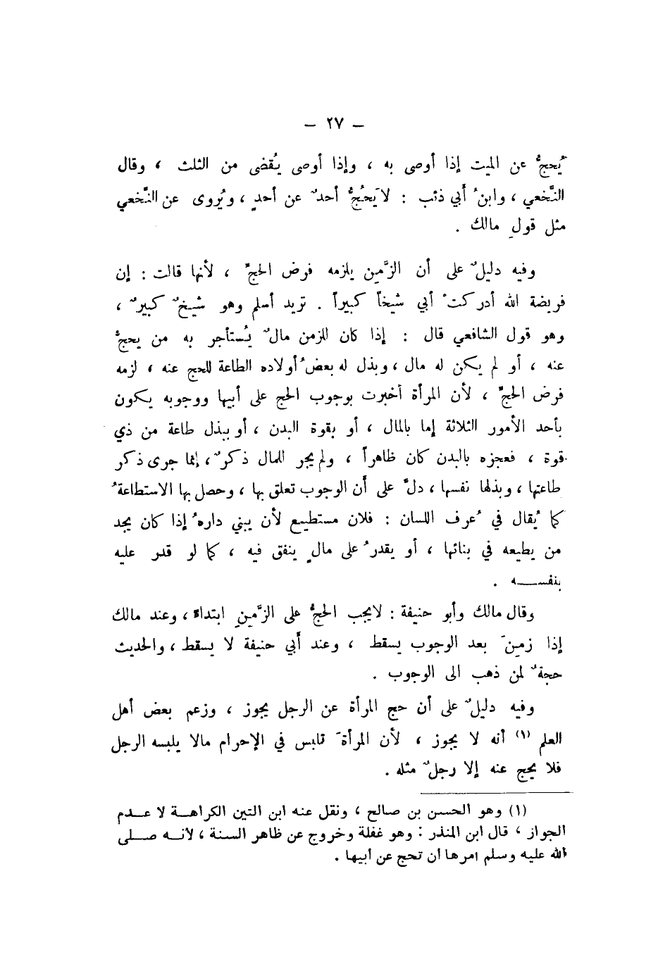 وَقَالَ مَالِكٌ، وَأَبُو حَنِيفَةَ: لَا يَجِبُ الْحَجُّ عَلَى الزَّمِنِ ابْتِدَاءً، وَعِنْدَ مَالِكٍ إِذَا زَمِنَ بَعْدَ الْوُجُوبِ يَسْقُطُ، وَعِنْدَ أَبِي حَنِيفَةَ لَا يَسْقُطُ، وَالْحَدِيثُ حُجَّةٌ لِمَنْ ذَهَبَ إِلَى الْوُجُوبِ.