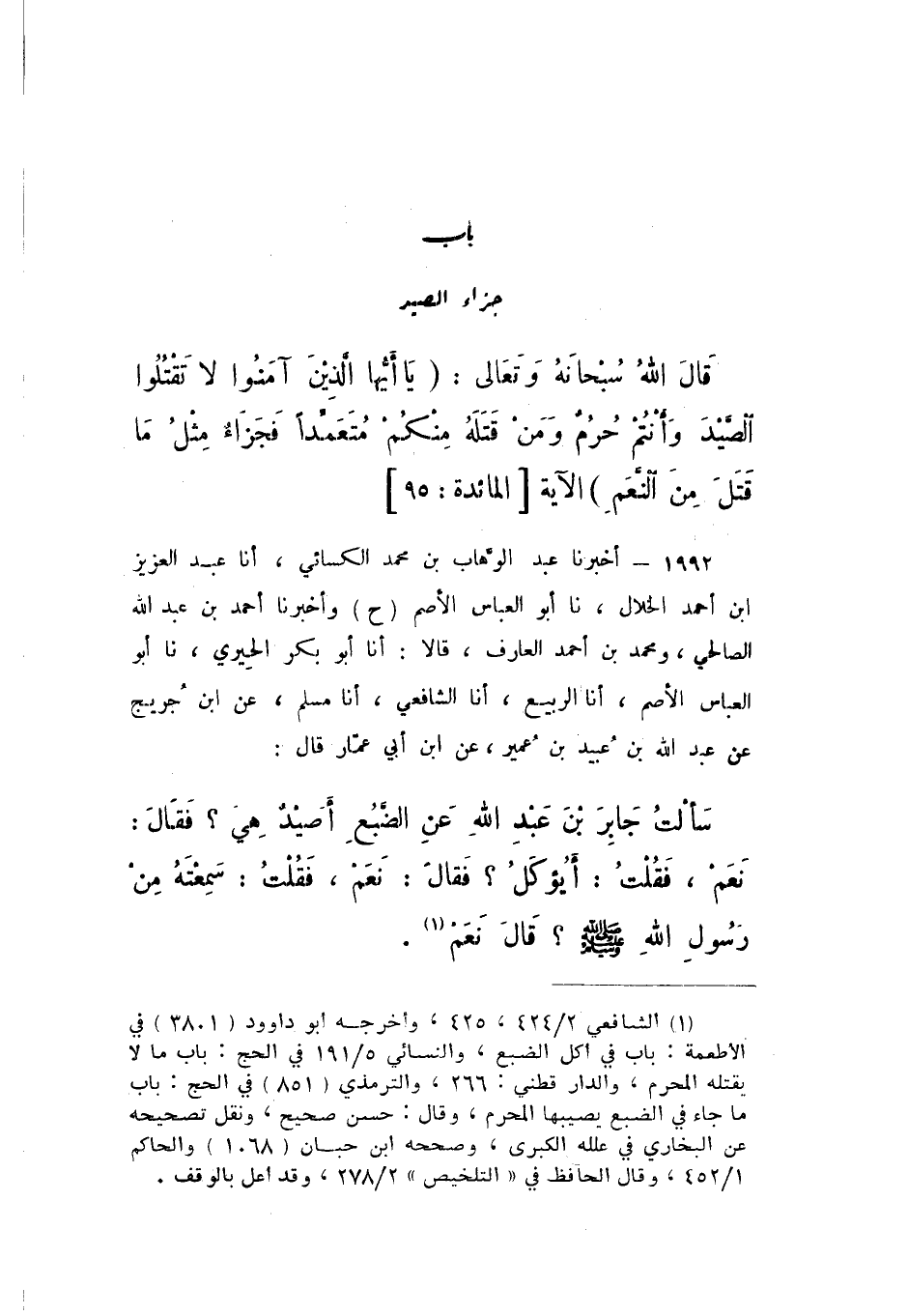 حَ وَأَخْبَرَنَا أَحْمَدُ بْنُ عَبْدِ اللَّهِ الصَّالِحِيُّ، وَمُحَمَّدُ بْنُ أَحْمَدَ الْعَارِفُ، قَالا: أَنا أَبُو بَكْرٍ الْحِيرِيُّ، نَا أَبُو الْعَبَّاسِ الْأَصَمُّ، أَنا الرَّبِيعُ، أَنا الشَّافِعِيُّ، أَنا مُسْلِمٌ، عَنِ ابْنِ جُرَيْجٍ، عَنْ عَبْدِ اللَّهِ بْنِ عُبَيْدِ بْنِ عُمَيْرٍ، عَنِ ابْنِ أَبِي عَمَّارٍ، قَالَ: " سَأَلْتُ جَابِرَ بْنَ عَبْدِ اللَّهِ، عَنِ الضَّبُعِ: أَصَيْدٌ هِيَ؟ فَقَالَ: نَعَمْ، فَقُلْتُ: أَيُؤْكَلُ؟ فَقَالَ: نَعَمْ، فَقُلْتُ: سَمِعْتَهُ مِنْ رَسُولِ اللَّهِ صَلَّى اللهُ عَلَيْهِ وَسَلَّمَ؟ قَالَ: نَعَمْ ".