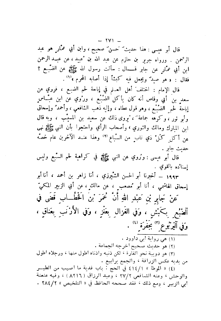 قَالَ الإِمَامُ: اخْتَلَفَ أَهْلُ الْعِلْمِ فِي إِبَاحَةِ لَحْمِ الضَّبُعِ، فَرُوِيَ عَنْ سَعْدِ بْنِ أَبِي وَقَّاصٍ، أَنَّهُ كَانَ يَأْكُلُ الضَّبُعَ، وَرُوِيَ عَنِ ابْنِ عَبَّاسٍ، إِبَاحَةُ لَحْمِ الضَّبُعِ، وَهُوَ قَوْلُ عَطَاءٍ، وَإِلَيْهِ ذَهَبَ الشَّافِعِيُّ، وَأَحْمَدُ، وَإِسْحَاقُ، وَأَبُو ثَوْرٍ، وَكَرِهَهُ جَمَاعَةٌ، يُرْوَى ذَلِكَ عَنْ سَعِيدِ بْنِ الْمُسَيِّبِ، وَبِهِ قَالَ ابْنُ الْمُبَارَكِ، وَمَالِكٌ، وَالثَّوْرِيُّ، وَأَصْحَابُ الرَّأْيِ، وَاحْتَجُّوا بِأَنَّ النَّبِيَّ صَلَّى اللهُ عَلَيْهِ وَسَلَّمَ «نَهَى عَنْ أَكْلِ كُلِّ ذِي نَابٍ مِنَ السِّبَاعِ»، وَهَذَا عِنْدَ الْآخَرِينَ عَامٌّ خَصَّهُ حَدِيثُ جَابِرٍ.