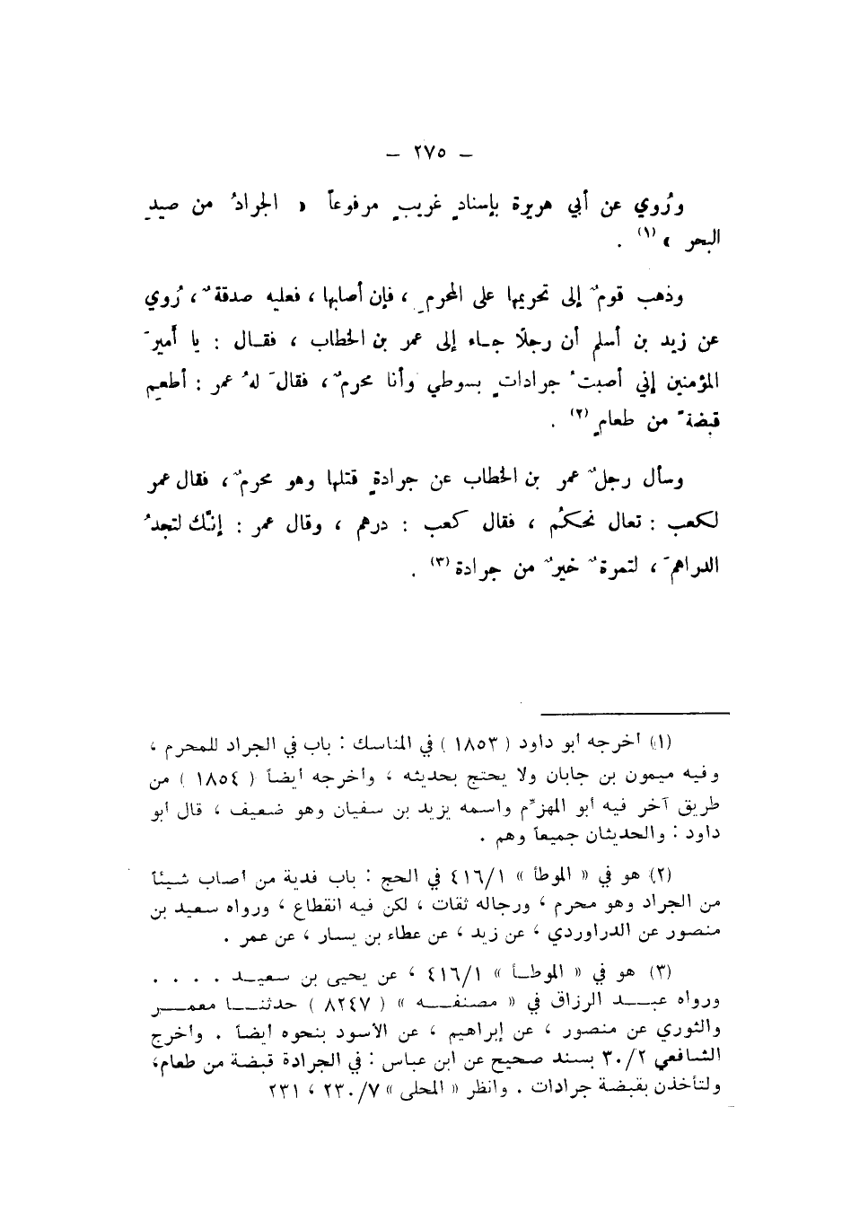 وَذَهَبَ قَوْمٌ إِلَى تَحْرِيمِهَا عَلَى الْمُحْرِمِ، فَإِنْ أَصَابَهَا، فَعَلَيْهِ صَدَقَةٌ، رُوِيَ عَنْ زَيْدِ بْنِ أَسْلَمَ أَنَّ رَجُلا جَاءَ إِلَى عُمَرَ بْنِ الْخَطَّابِ، فَقَالَ: يَا أَمِيرَ الْمُؤْمِنِينَ، إِنِّي أَصَبْتُ جَرَادَاتٍ بِسَوْطِي وَأَنَا مُحْرِمٌ، فَقَالَ لَهُ عُمَرُ: أَطْعِمْ قَبْضَةً مِنْ طَعَامٍ.