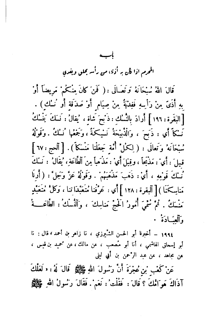 1994 - أَخْبَرَنَا أَبُو الْحَسَنِ الشِّيرَزِيُّ، نَا زَاهِرُ بْنُ أَحْمَدَ، قَالَ: نَا أَبُو إِسْحَاقَ الْهَاشِمِيُّ، أَنا أَبُو مُصْعَبٍ، عَنْ مَالِكٍ، عَنْ حُمَيْدِ بْنِ قَيْسٍ، عَنْ مُجَاهِدٍ، عَنْ عَبْدِ الرَّحْمَنِ بْنِ أَبِي لَيْلَى، عَنْ كَعْبِ بْنِ عُجْرَةَ، أَنّ رَسُولَ اللَّهِ صَلَّى اللهُ عَلَيْهِ وَسَلَّمَ، قَالَ لَهُ: «لَعَلَّكَ آذَاكَ هَوَامُّكَ؟»، قَالَ: فَقُلْتُ: نَعَمْ، فَقَالَ رَسُولُ اللَّهِ صَلَّى اللهُ عَلَيْهِ وَسَلَّمَ: «