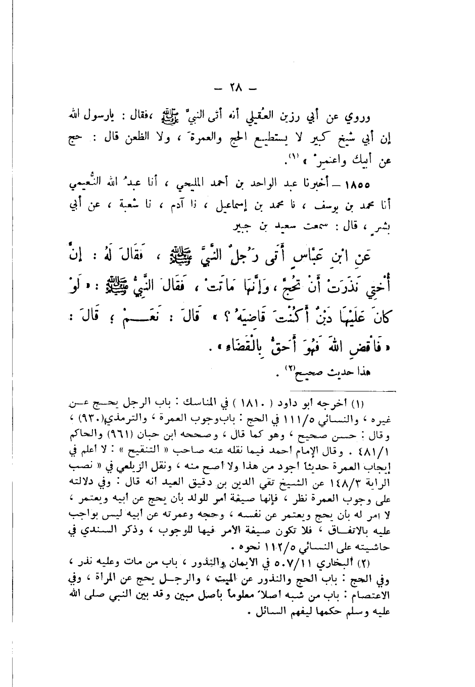 وَرُوِيَ عَنْ أَبِي رَزِينٍ الْعُقَيْلِيِّ، أَنَّهُ أَتَى النَّبِيَّ صَلَّى اللهُ عَلَيْهِ وَسَلَّمَ، فَقَالَ: يَا رَسُولَ اللَّهِ، إِنَّ أَبِي شَيْخٌ كَبِيرٌ لَا يَسْتَطِيعُ الْحَجَّ وَالْعُمْرَةَ، وَلا الظَّعْنَ، قَالَ: «حُجَّ عَنْ أَبِيكَ وَاعْتَمِرْ».