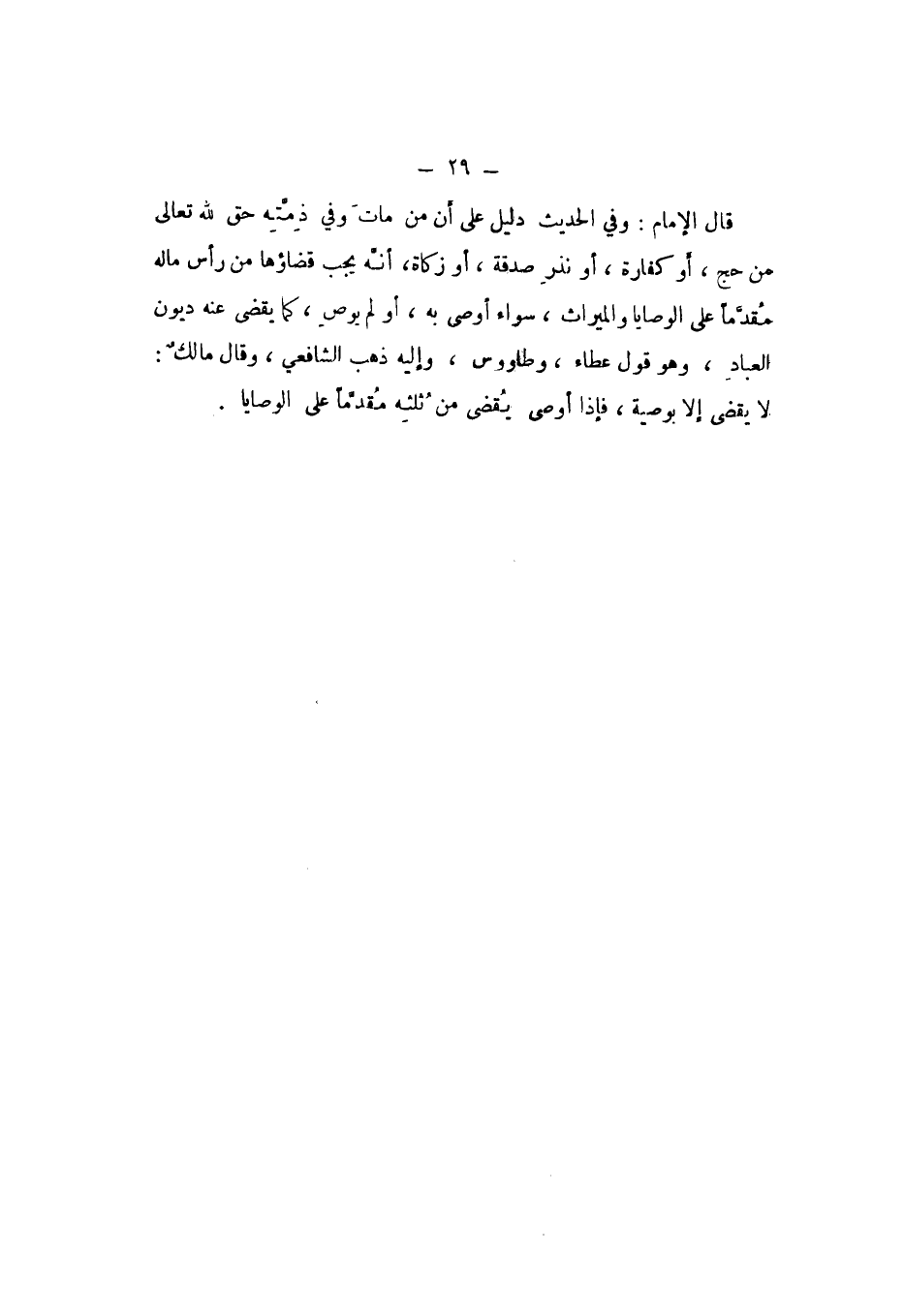قَالَ الإِمَامُ: وَفِي الْحَدِيثِ دَلِيلٌ عَلَى أَنَّ مَنْ مَاتَ وَفِي ذِمَّتِهِ حَقٌّ لِلَّهِ تَعَالَى مِنْ حَجٍّ، أَوْ كَفَّارَةٍ، أَوْ نَذْرِ صَدَقَةٍ، أَوْ زَكَاةٍ، أَنَّهُ يَجِبُ قَضَاؤُهَا مِنْ رَأْسِ مَالِهِ مُقَدَّمًا عَلَى الْوَصَايَا، وَالْمِيرَاثِ، سَوَاءٌ أَوْصَى بِهِ، أَوْ لَمْ يُوصِ، كَمَا يَقْضِي عَنْهُ دُيُونَ الْعِبَادِ، وَهُوَ قَوْلُ عَطَاءٍ، وَطَاوُسٍ، وَإِلَيْهِ ذَهَبَ الشَّافِعِيُّ، وَقَالَ مَالِكٌ: لَا يَقْضِي إِلا بِوَصِيَّةٍ، فَإِذَا أَوْصَى يَقْضِي مِنْ ثُلُثِهِ مُقَدَّمًا عَلَى الْوَصَايَا.