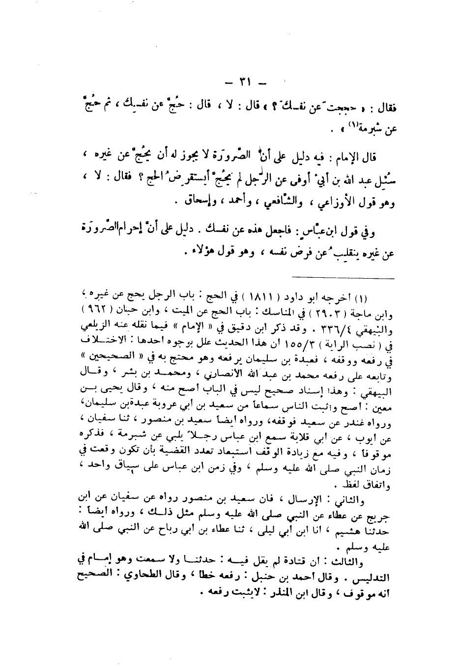 قَالَ الإِمَامُ: فِيهِ دَلِيلٌ عَلَى أَنَّ الصَّرُورَةَ لَا يَجُوزُ لَهُ أَنْ يَحُجَّ عَنْ غَيْرِهِ، سُئِلَ عَبْدُ اللَّهِ بْنُ أَبِي أَوْفَى عَنِ الرَّجُلِ لَمْ يَحُجَّ، أَيَسْتَقْرِضُ الْحَجَّ؟ فَقَالَ: لَا، وَهُوَ قَوْلُ الأَوْزَاعِيِّ، وَالشَّافِعِيِّ، وَأَحْمَدَ، وَإِسْحَاقَ.