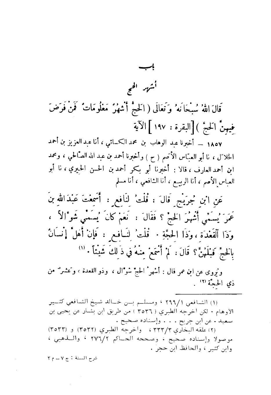حَ وَأَخْبَرَنَا أَحْمَدُ بْنُ عَبْدِ اللَّهِ الصَّالِحِيُّ، وَمُحَمَّدُ بْنُ أَحْمَدَ الْعَارِفُ، قَالا: نَا أَبُو بَكْرٍ أَحْمَدُ بْنُ الْحَسَنِ الْحِيرِيُّ، نَا أَبُو الْعَبَّاسِ الأَصَمُّ، أَنا الرَّبِيعُ، أَنا الشَّافِعِيُّ، أَنا مُسْلِمٌ، عَنِ ابْنِ جُرَيْجٍ، قَالَ: قُلْتُ لِنَافِعٍ: " أَسَمِعْتَ عَبْدَ اللَّهِ بْنَ عُمَرَ يُسَمِّي أَشْهُرَ الْحَجِّ؟ فَقَالَ: نَعَمْ، كَانَ يُسَمِّي شَوَّالا، وَذَا الْقَعْدَةِ، وَذَا الْحِجَّةِ، قُلْتُ لِنَافِعٍ: فَإِنْ أَهَلَّ إِنْسَانٌ بِالْحَجِّ قَبْلَهُنَّ؟ قَالَ: لَمْ أَسْمَعْ مِنْهُ فِي ذَلِكَ شَيْئًا "