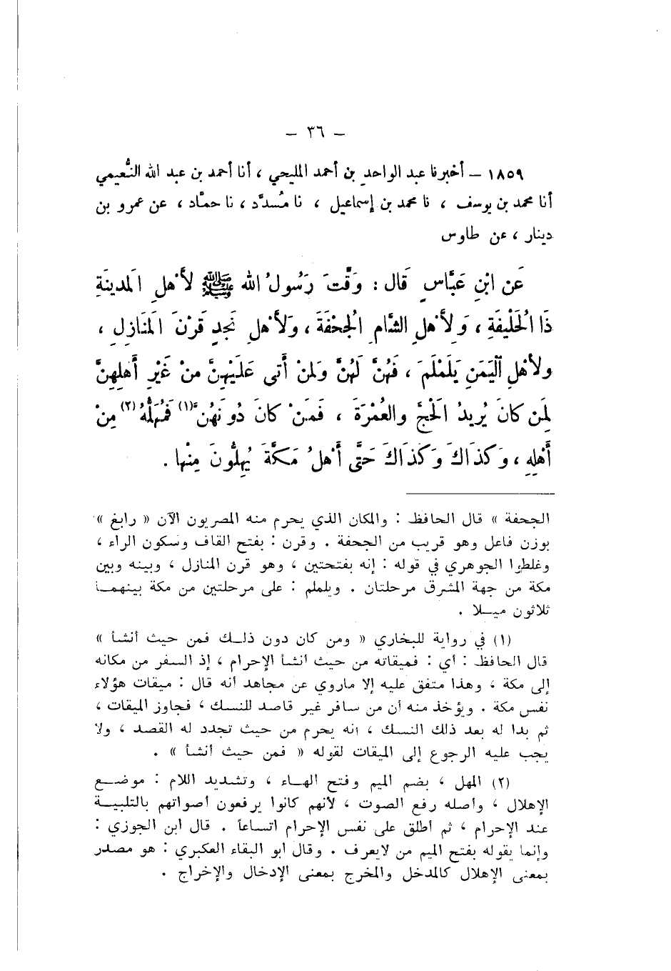 1859 - أَخْبَرَنَا عَبْدُ الْوَاحِدِ بْنُ أَحْمَدَ الْمَلِيحِيُّ، أَنا أَحْمَدُ بْنُ عَبْدِ اللَّهِ النُّعَيْمِيُّ، أَنا مُحَمَّدُ بْنُ يُوسُفَ، نَا مُحَمَّدُ بْنُ إِسْمَاعِيلَ، نَا مُسَدَّدٌ، نَا حَمَّادٌ، عَنْ عَمْرِو بْنِ دِينَارٍ، عَنْ طَاوُسٍ، عَنِ ابْنِ عَبَّاسٍ، قَالَ: «وَقَّتَ رَسُولُ اللَّهِ صَلَّى اللهُ عَلَيْهِ وَسَلَّمَ لأَهْلِ الْمَدينَةِ ذَا الْحُلَيْفَةِ، وَلأَهْلِ الشَّامِ الْجُحْفَةَ، وَلأَهْلِ نَجْدٍ قَرْنَ الْمَنَازِلِ، وَلأَهْلِ الْيَمَنِ يَلَمْلَمَ، فَهُنَّ لَهُنَّ، وَلِمَنْ أَتَى عَلَيْهِنَّ مِنْ غَيْرِ أَهْلِهِنَّ لِمَنْ كَانَ يُرِيدُ الْحَجَّ وَالْعُمْرَةَ، فَمَنْ كَانَ دُونَهُنَّ، فَمهله مِنْ أَهْلِهِ، وَكَذَاكَ وَكَذَاكَ حَتَّى أَهْلُ مَكَّةَ يُهِلُّونَ مِنْهَا».