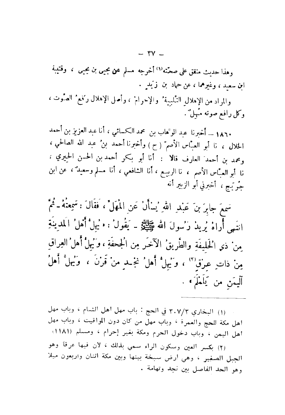 حَ وَأَخْبَرَنَا أَحْمَدُ بْنُ عَبْدِ اللَّهِ الصَّالِحِيُّ، وَمُحَمَّدُ بْنُ أَحْمَدَ الْعَارِفُ، قَالا: أَنا أَبُو بَكْرٍ أَحْمَدُ بْنُ الْحَسَنِ الْحِيرِيُّ، نَا أَبُو الْعَبَّاسِ الأَصَمُّ، نَا الرَّبِيعُ، أَنا الشَّافِعِيُّ، أَنا مُسْلِمٌ، وَسَعِيدٌ، عَنِ ابْنِ جُرَيْجٍ، أَخْبَرَنِي أَبُو الزُّبَيْرِ، أَنَّهُ سَمِعَ جَابِرَ بْنَ عَبْدِ اللَّهِ يُسْأَلُ عَنِ الْمَهَلِّ، فَقَالَ: سَمِعْتُهُ، ثُمَّ انْتَهَى أَرَاهُ يُرِيدُ رَسُولَ اللَّهِ صَلَّى اللهُ عَلَيْهِ وَسَلَّمَ، يَقُولُ: «يُهِلُّ أَهْلُ الْمَدِينَةِ مِنْ ذِي الْحُلَيْفَةِ وَالطَّرِيقُ الْآخَرُ مِنَ الْجُحْفَةِ، وَيُهِلُّ أَهْلُ الْعِرَاقِ مِنْ ذَاتِ عِرْقٍ، وَيُهِلُّ أَهْلُ نَجْدٍ مِنْ قَرْنٍ، وَيُهِلُّ أَهْلُ الْيَمَنِ مِنْ يَلَمْلَمَ».