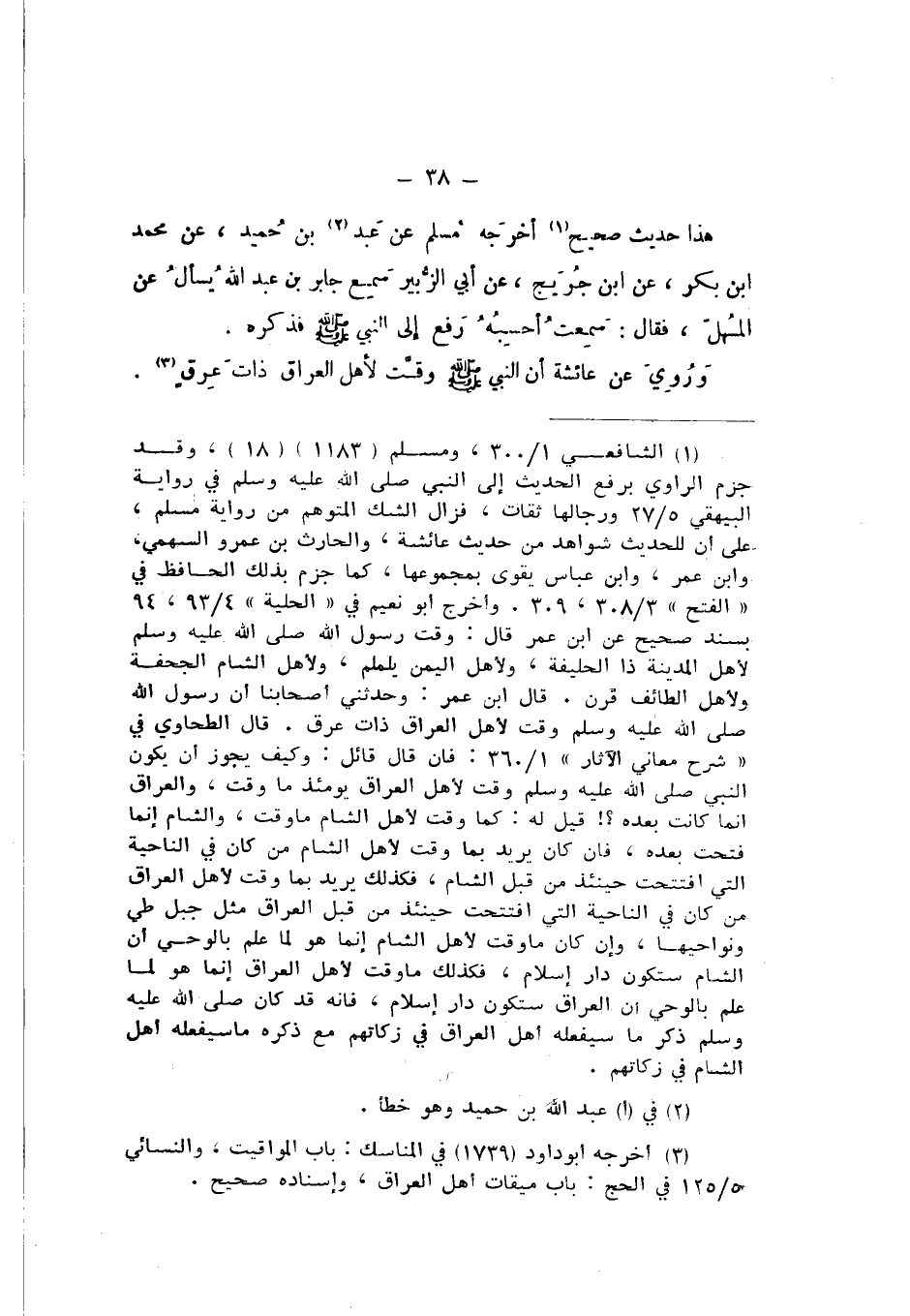 وَرُوِيَ عَنْ عَائِشَةَ، أَنَّ النَّبِيَّ صَلَّى اللهُ عَلَيْهِ وَسَلَّمَ وَقَّتَ لأَهْلِ الْعِرَاقِ ذَاتَ عِرْقٍ.