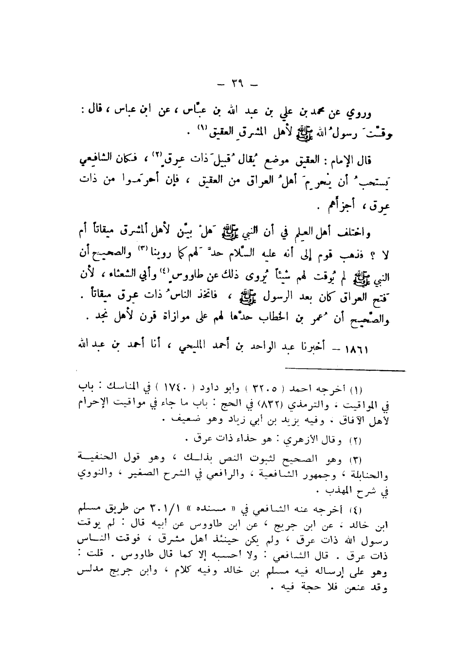 وَرُوِيَ عَنْ مُحَمَّدِ بْنِ عَلِيِّ بْنِ عَبْدِ اللَّهِ بْنِ عَبَّاسٍ، عَنِ ابْنِ عَبَّاسٍ، قَالَ: وَقَّتَ رَسُولُ اللَّهِ صَلَّى اللهُ عَلَيْهِ وَسَلَّمَ لأَهْلِ الْمَشْرِقِ الْعَقِيقَ.