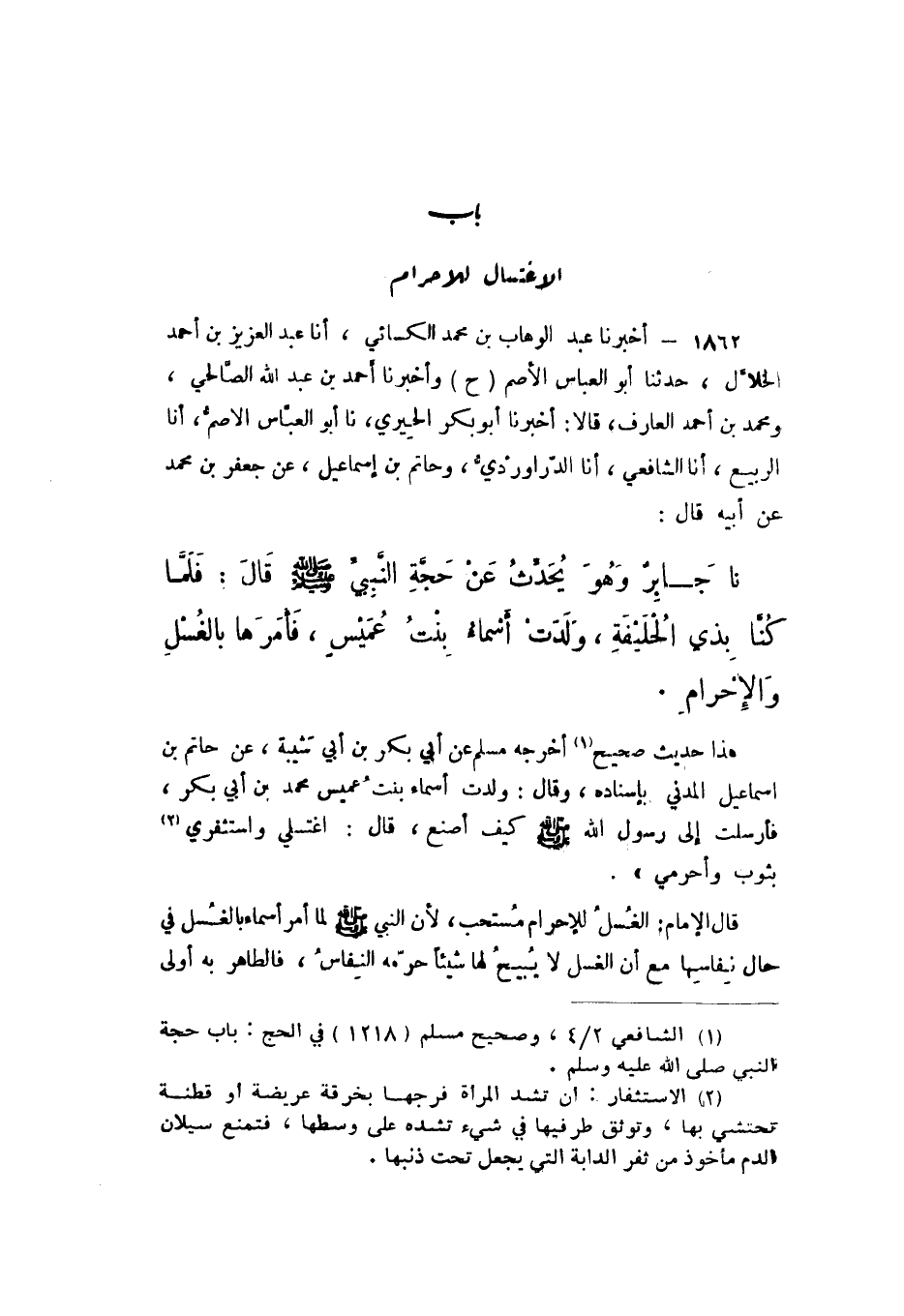 حَ وَأَخْبَرَنَا أَحْمَدُ بْنُ عَبْدِ اللَّهِ الصَّالِحِيُّ، وَمُحَمَّدُ بْنُ أَحْمَدَ الْعَارِفُ، قَالا: أَخْبَرَنَا أَبُو بَكْرٍ الْحِيرِيُّ، نَا أَبُو الْعَبَّاسِ الأصَمُّ، أَنا الرَّبِيعُ، أَنا الشَّافِعِيُّ، أَنا الدَّرَاوَرْدِيُّ، وَحَاتِمُ بْنُ إِسْمَاعِيلَ، عَنْ جَعْفَرِ بْنِ مُحَمَّدٍ، عَنْ أَبِيهِ، قَالَ: نَا جَابِرٌ، وَهُوَ يُحَدِّثُ عَنْ حَجَّةِ النَّبِيِّ صَلَّى اللهُ عَلَيْهِ وَسَلَّمَ، قَالَ: «فَلَمَّا كُنَّا بِذِي الْحُلَيْفَةِ، وَلَدَتْ أَسْمَاءُ بِنْتُ عُمَيْسٍ، فَأَمَرَهَا بِالْغُسْلِ وَالإِحْرَامِ».