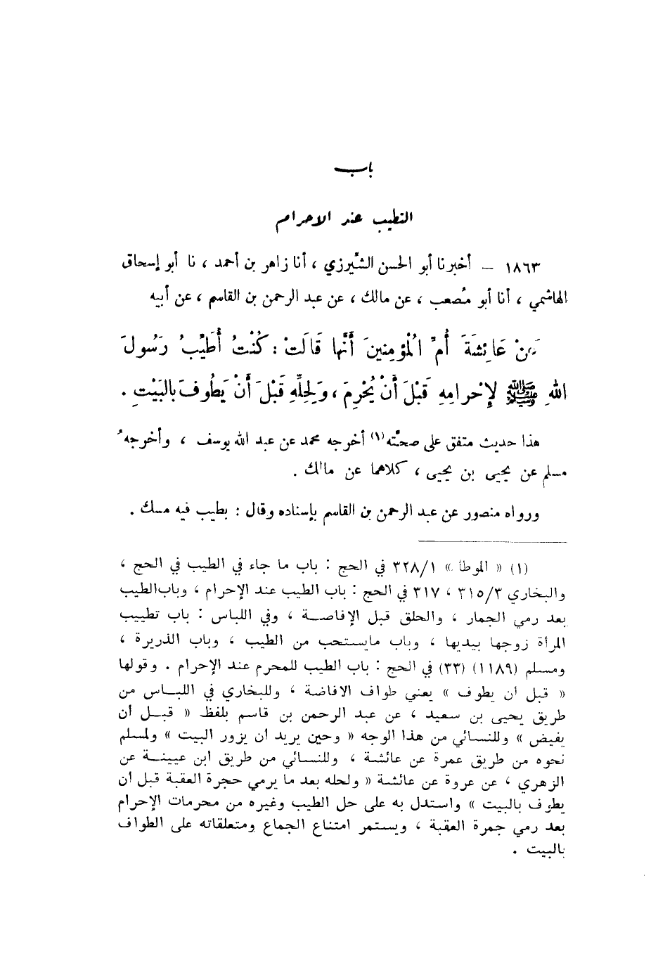 1863 - أَخْبَرَنَا أَبُو الْحَسَنِ الشِّيرَزِيُّ، أَنا زَاهِرُ بْنُ أَحْمَدَ، نَا أَبُو إِسْحَاقَ الْهَاشِمِيُّ، أَنا أَبُو مُصْعَبٍ، عَنْ مَالِكٍ، عَنْ عَبْدِ الرَّحْمَنِ بْنِ الْقَاسِمِ، عَنْ أَبِيهِ، عَنْ عَائِشَةَ أُمِّ الْمُؤْمِنِينَ، أَنَّهَا قَالَتْ: «كُنْتُ أُطَيِّبُ رَسُولَ اللَّهِ صَلَّى اللهُ عَلَيْهِ وَسَلَّمَ لإِحْرَامِهِ قَبْلَ أَنْ يُحْرِمَ، وَلِحِلِّهِ قَبْلَ أَنْ يَطُوفَ بِالْبَيْتِ».