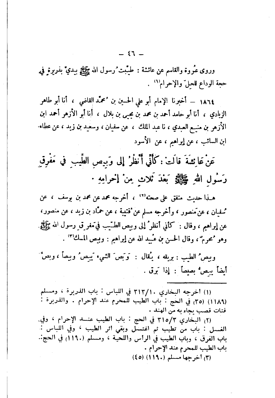 1864 - أَخْبَرَنَا الإِمَامُ أَبُو عَلِيٍّ الْحُسَيْنُ بْنُ مُحَمَّدٍ الْقَاضِي، أَنا أَبُو طَاهِرٍ الزِّيَادِيُّ، أَنا أَبُو حَامِدٍ أَحْمَدُ بْنُ مُحَمَّدِ بْنِ يَحْيَى بْنِ بِلالٍ، أَنا أَبُو الْأَزْهَرِ أَحْمَدُ بْنُ الْأَزْهَرِ بْنِ مَنِيعٍ الْعَبْدِيُّ، نَا عَبْدُ الْمَلِكِ، عَنْ سُفْيَانَ، وَسَعِيدِ بْنِ زَيْدٍ، عَنْ عَطَاءِ بْنِ السَّائِبِ، عَنْ إِبْرَاهِيمَ، عَنِ الْأَسْوَدِ، عَنْ عَائِشَةَ، قَالت: كَأَنِّي أَنْظُرُ إِلَى وَبِيصِ الطِّيبِ فِي مَفْرِقِ رَسُولِ اللَّهِ صَلَّى اللهُ عَلَيْهِ وَسَلَّمَ بَعْدَ ثَلاثٍ مِنْ إِحْرَامِهِ.