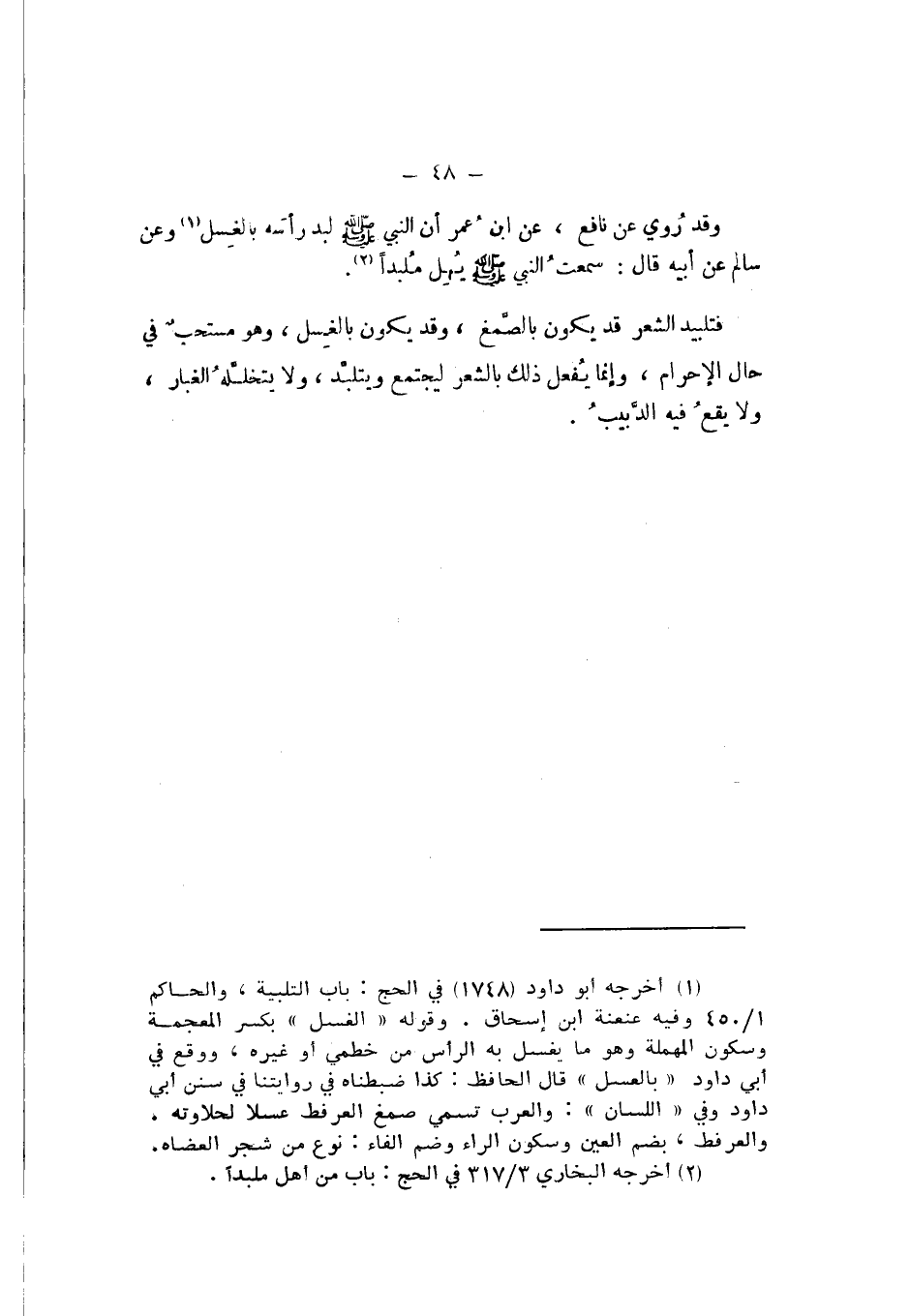 وَقَدْ رُوِيَ عَنْ نَافِعٍ، عَنِ ابْنِ عُمَرَ، أَنَّ النَّبِيَّ صَلَّى اللهُ عَلَيْهِ وَسَلَّمَ لَبَّدَ رَأْسَهُ بِالْعَسَلِ، وَعَنْ سَالِمٍ، عَنْ أَبِيهِ، قَالَ: سَمِعْتُ النَّبِيَّ صَلَّى اللهُ عَلَيْهِ وَسَلَّمَ يُهِلُّ مُلَبِّدًا.