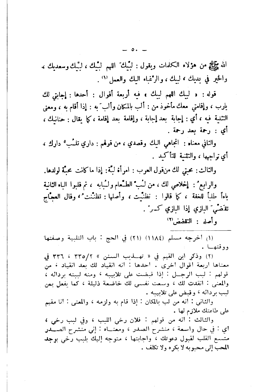 قَوْلُهُ: «لَبَّيْكَ اللَّهُمَّ لَبَّيْكَ»، فِيهِ أَرْبَعَةُ أَقْوَالٍ: أَحَدُهَا: إِجَابَتِي لَكَ يَارَبِّ، وَإِقَامَتِي مَعَكَ مَأْخُوذٌ مِنْ: أَلَبَّ بِالْمَكَانِ، وَأَلَبَّ بِهِ: إِذَا أَقَامَ بِهِ، وَمَعْنَى التَّثْنِيَةِ فِيهِ، أَيْ: إِجَابَةٌ بَعْدَ إِجَابَةٍ، وَإِقَامَةٌ بَعْدَ إِقَامَةٍ، كَمَا يُقَالُ: حَنَانَيْكَ، أَيْ: رَحْمَةٌ بَعْدَ رَحْمَةٍ.