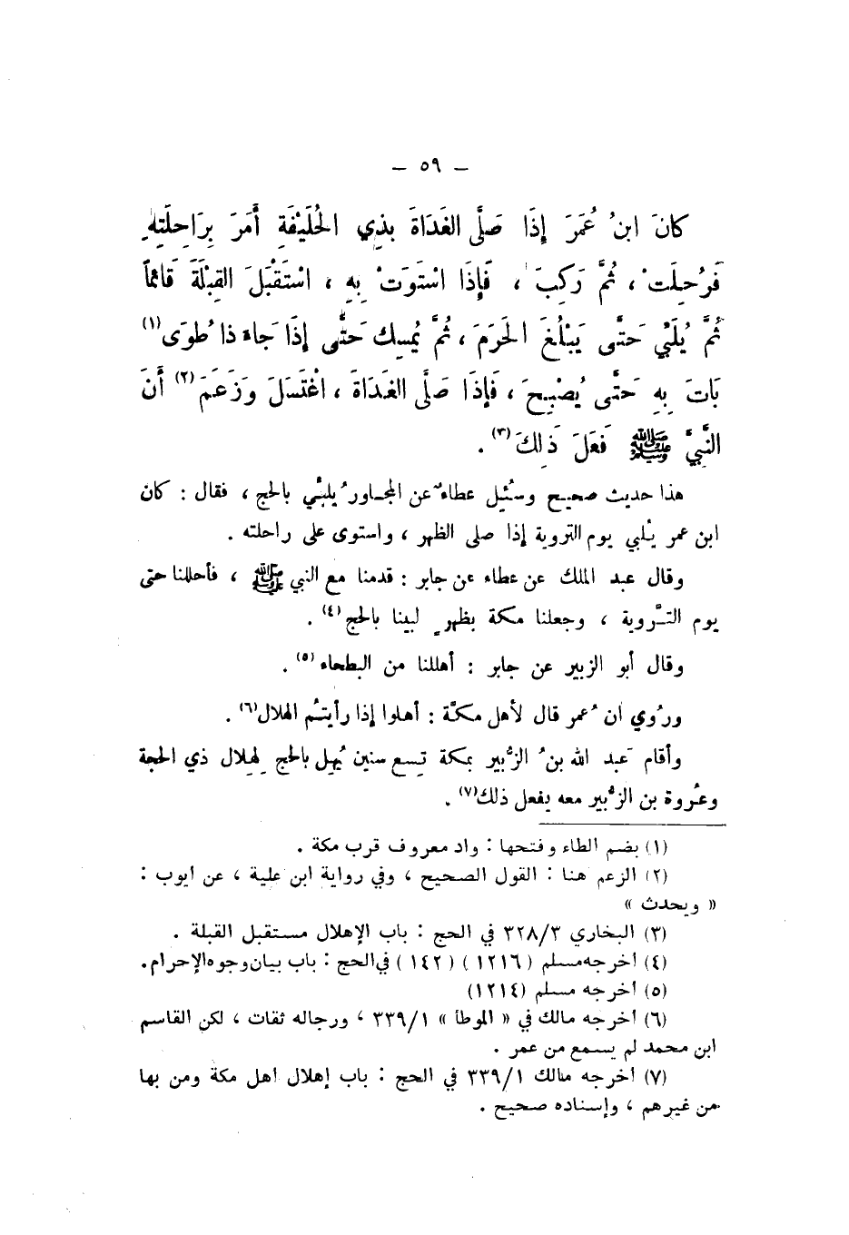 كَانَ ابْنُ عُمَرَ إِذَا صَلَّى الْغَدَاةَ بِذِي الْحُلَيْفَةِ أَمَرَ بِرَاحِلَتِهِ، فَرُحِلَتْ، ثُمَّ رَكِبَ، فَإِذَا اسْتَوَتْ بِهِ، اسْتَقْبَلَ الْقِبْلَةَ قَائِمًا، ثُمَّ يُلَبِّي حَتَّى يَبْلُغَ الْحَرَمَ، ثُمَّ يُمْسِكُ حَتَّى إِذَا جَاءَ ذَا طُوًى بَاتَ بِهِ حتَّى يُصْبِحَ، فَإِذَا صَلَّى الْغَدَاةَ، اغْتَسَلَ.