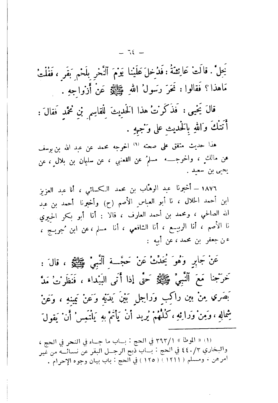 يَحِلَّ، قَالَتْ عَائِشَةُ: فَدخِلَ عَلَيْنَا يَوْمَ النَّحْرِ بِلَحْمِ بَقَرٍ، فَقُلْتُ: مَا هَذَا؟ فَقَالُوا: نَحَرَ رَسُولُ اللَّهِ صَلَّى اللهُ عَلَيْهِ وَسَلَّمَ عَنْ أَزْوَاجِهِ ".