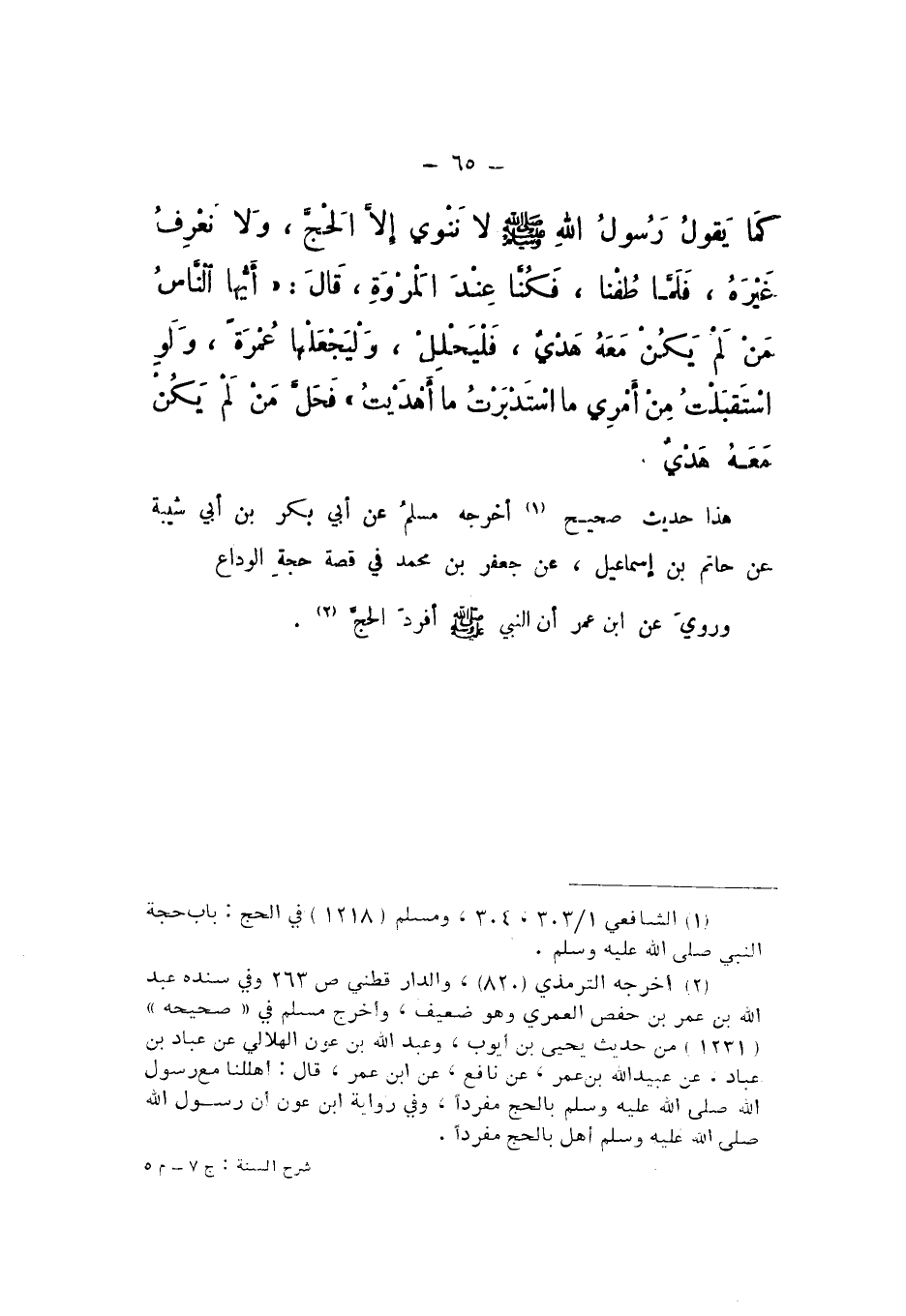 وَرُوِيَ عَنِ ابْنِ عُمَرَ، أَنَّ النَّبِيَّ صَلَّى اللهُ عَلَيْهِ وَسَلَّمَ أَفْرَدَ الْحَجَّ.