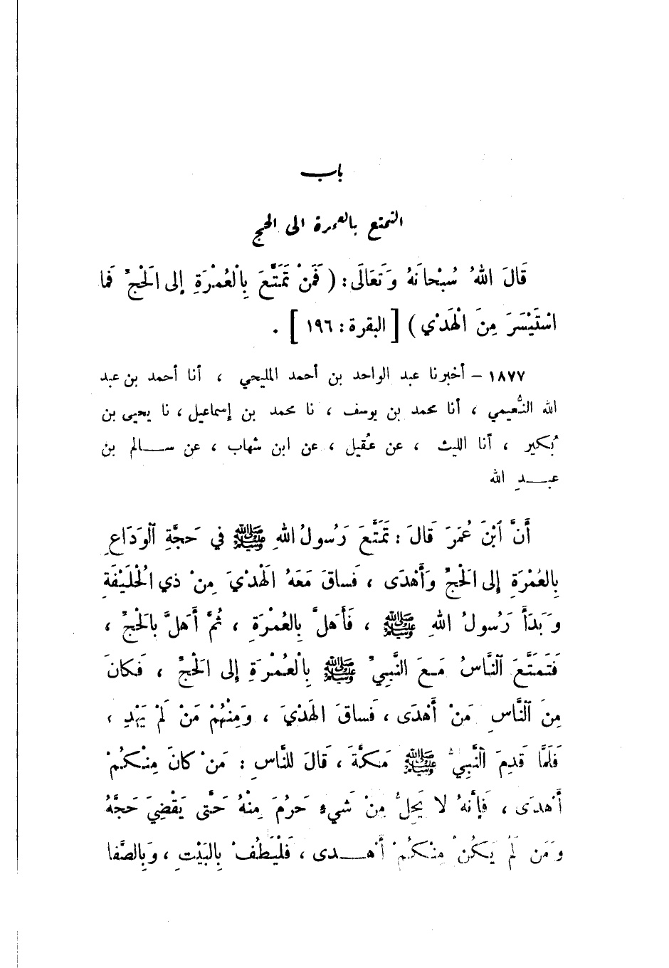 1877 - أَخْبَرَنَا عَبْدُ الْوَاحِدِ بْنُ أَحْمَدَ الْمَلِيحِيُّ، أَنا أَحْمَدُ بْنُ عَبْدِ اللَّهِ النُّعَيْمِيُّ، أَنا مُحَمَّدُ بْنُ يُوسُفَ، نَا مُحَمَّدُ بْنُ إِسْمَاعِيلَ، نَا يَحْيَى بْنُ بُكَيْرٍ، أَنا اللَّيْثُ، عَنْ عَقِيلٍ، عَنِ ابْنِ شِهَابٍ، عَنْ سَالِمِ بْنِ عَبْدِ اللَّهِ، أَنَّ ابْنَ عُمَرَ، قَالَ: تَمَتَّعَ رَسُولُ اللَّهِ صَلَّى اللهُ عَلَيْهِ وَسَلَّمَ فِي حَجَّةِ الْوَدَاعِ بِالْعُمْرَةِ إِلَى الْحَجِّ وَأَهْدَى، فَسَاقَ مَعَهُ الْهَدْيَ مِنْ ذِي الْحُلَيْفَةِ، وَبَدَأَ رَسُولُ اللَّهِ صَلَّى اللهُ عَلَيْهِ وَسَلَّمَ، فَأَهَلَّ بِالْعُمْرَةِ، ثُمَّ أَهَلَّ بِالْحَجِّ، فَتَمَتَّعَ النَّاسُ مَعَ النَّبِيِّ صَلَّى اللهُ عَلَيْهِ وَسَلَّمَ بِالْعُمْرَةِ إِلَى الْحَجِّ، فَكانَ مِنَ النَّاسِ مَنْ أَهْدَى، فَسَاقَ الْهَدْيَ، وَمنْهُمْ مَنْ لَمْ يَهْدِ، فَلَمَّا قَدِمَ النَّبِيُّ صَلَّى اللهُ عَلَيْهِ وَسَلَّمَ مَكَّةَ، قَالَ لِلنَّاسِ: «مَنْ كَانَ مِنْكُمْ أَهْدَى، فَإِنَّهُ لَا يَحِلُّ مِنْ شَيْءٍ حَرُمَ منْهُ حتَّى يَقْضِيَ حَجَّهُ، وَمَنْ لَمْ يَكُنْ مِنْكُمْ أَهْدَى، فَلْيَطُفْ بِالْبَيْتِ، وَبِالصَّفَا