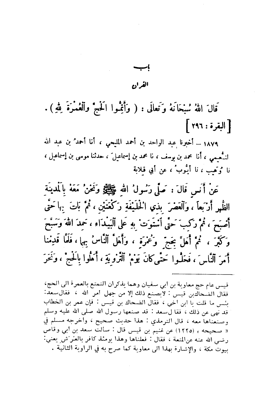 1879 - أَخْبَرَنَا عَبْدُ الْوَاحِدِ بْنُ أَحْمَدَ الْمَلِيحِيُّ، أَنا أَحْمَدُ بْنُ عَبْدِ اللَّهِ النُّعَيْمِيُّ، أَنا مُحَمَّدُ بْنُ يُوسُفَ، نَا مُحَمَّدُ بْنُ إِسْمَاعِيلَ، حَدَّثَنَا مُوسَى بْنُ إِسْمَاعِيلَ، نَا وُهَيْبٌ، نَا أَيُّوبُ، عَنْ أَبِي قِلابَةَ، عَنْ أَنَسٍ، قَالَ: «صَلَّى رَسُولُ اللَّهِ صَلَّى اللهُ عَلَيْهِ وَسَلَّمَ وَنَحْنُ مَعَهُ بِالْمَدِينَةِ الظُّهْرَ أَرْبَعًا، وَالْعَصْرَ بِذِي الْحُلَيْفَةِ رَكْعَتَيْنِ، ثُمَّ بَاتَ بِهَا حَتَّى أَصْبَحَ، ثُمَّ رَكِبَ حتَّى اسْتَوَتْ بِهِ عَلَى الْبَيْدَاءِ، حَمِدَ اللَّهَ وَسَبَّحَ وَكَبَّرَ، ثُمَّ أَهَلَّ بِحَجٍّ وَعُمْرَةٍ، وَأَهَلَّ النَّاسُ بِهِمَا، فَلَمَّا قَدِمْنَا أَمَرَ النَّاسَ، فَحَلُّوا حَتَّى كَانَ يَوْمُ التَّرْوِيَةِ، أَهَلُّوا بِالْحَجِّ، وَنَحَرَ