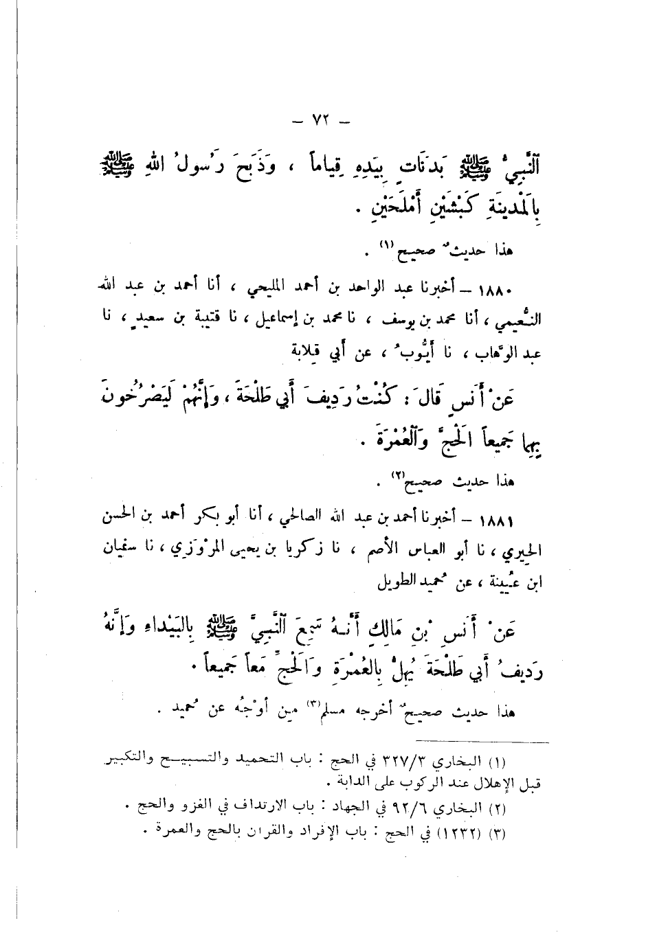 1880 - أَخْبَرَنَا عَبْدُ الْوَاحِدِ بْنُ أَحْمَدَ الْمَلِيحِيُّ، أَنا أَحْمَدُ بْنُ عَبْدِ اللَّهِ النُّعَيْمِيُّ، أَنا مُحَمَّدُ بْنُ يُوسُفَ، نَا مُحَمَّدُ بْنُ إِسْمَاعِيلَ، نَا قُتَيْبَةُ بْنُ سَعِيدٍ، نَا عَبْدُ الْوَهَّابِ، نَا أَيُّوبُ، عَنْ أَبِي قِلابَةَ، عَنْ أَنَسٍ، قَالَ: «كُنْتُ رَدِيفَ أَبِي طَلْحَةَ، وَإِنَّهُمْ لَيَصْرُخُونَ بِهِمَا جَمِيعًا الْحَجِّ وَالْعُمْرَةِ».