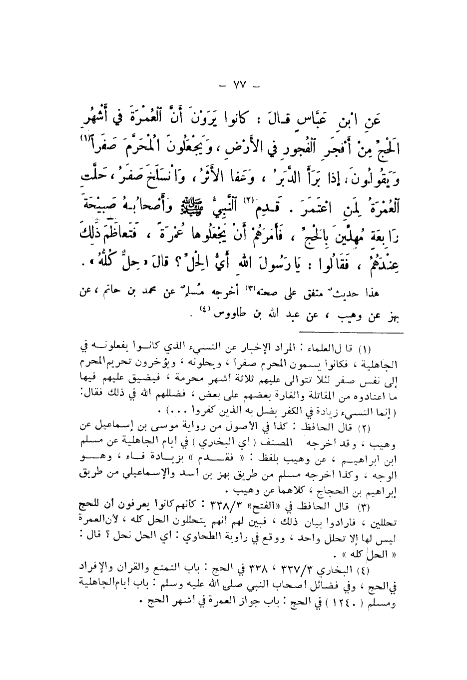 عَنِ ابْنِ عَبَّاسٍ، قَالَ: كَانُوا يَرَوْنَ أَنَّ الْعُمْرَةَ فِي أَشْهُرِ الْحَجِّ مِنْ أَفْجَرِ الْفُجُورِ فِي الْأَرْضِ، وَيَجْعَلُونَ الْمُحَرَّمَ صَفَرًا، وَيَقُولُونَ: إِذَا بَرَأَ الدَّبَرُ، وَعَفَا الْأَثَرُ، وَانْسَلَخَ صَفَرٌ، حَلَّتِ الْعُمْرَةُ لِمَنِ اعْتَمَرَ.