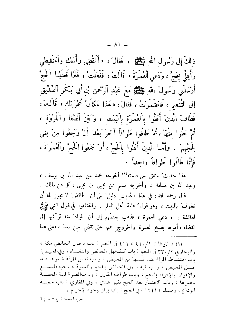 ذَلِكَ إِلَى رَسُولِ اللَّهِ صَلَّى اللهُ عَلَيْهِ وَسَلَّمَ، فَقَالَ: «انْقُضِي رَأْسَكِ، وَامْتَشِطِي، وَأَهِلِّي بِحَجٍّ، وَدَعِي الْعُمْرَةَ»، قَالَتْ: فَفَعَلْتُ، فَلَمَّا قَضَيْنَا الْحَجَّ، أرْسَلَنِي رَسُولُ اللَّهِ صَلَّى اللهُ عَلَيْهِ وَسَلَّمَ مَعَ عَبْدِ الرَّحْمَنِ بْنِ أَبِي بَكْرٍ الصِّدِّيقِ إِلَى التَّنْعِيمِ، فَاعْتَمَرْتُ، فَقَالَ: «هَذَا مَكَانُ عُمْرَتِكِ»، قَالَتْ: فَطَافَ الَّذِينَ أَهَلُّوا بِالْعُمْرَةِ بِالْبَيْتِ، وَبَيْنَ الصَّفَا وَالْمَرْوَةِ، ثُمَّ حَلُّوا مِنْهَا، ثُمَّ طَافُوا طَوَافًا آخَرَ بَعْدَ أَنْ رَجَعُوا مِنْ مِنًى لِحَجِّهِمْ.