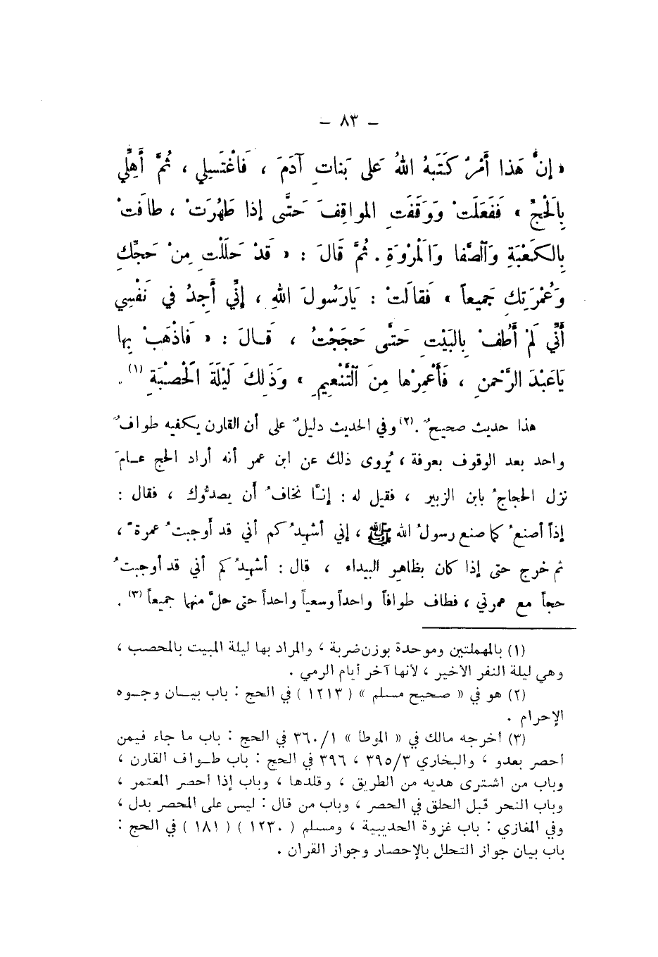 إِنَّ هَذَا أَمْرٌ كَتَبهُ اللَّهُ عَلَى بَنَاتِ آدَمَ، فَاغْتَسِلِي، ثُمَّ أَهِلِّي بِالْحَجِّ»، فَفَعَلَتْ، وَوَقَفَتِ الْمَوَاقِفَ، حَتَّى إِذَا طَهُرَتْ، طَافَتْ بِالْكَعْبَةِ، وَالصَّفَا وَالْمَرْوَةِ، ثُمَّ قَالَ: «قَدْ حَلَلْتُ مِنْ حَجِّكِ وَعُمْرَتِكِ جَمِيعًا»، فَقَالَتْ: يَا رَسُولَ اللَّهِ، إِنِّي أَجِدُ فِي نَفْسِي أَنِّي لَمْ أَطُفْ بِالْبَيْتِ حَتَّى حَجَجْتُ، قَالَ: «فَاذْهَبْ بِهَا يَا عَبْدَ الرَّحْمَنِ، فَأَعْمِرْهَا مِنَ التَّنْعِيمِ»، وَذَلِكَ لَيْلَةَ الْحَصْبَةِ.