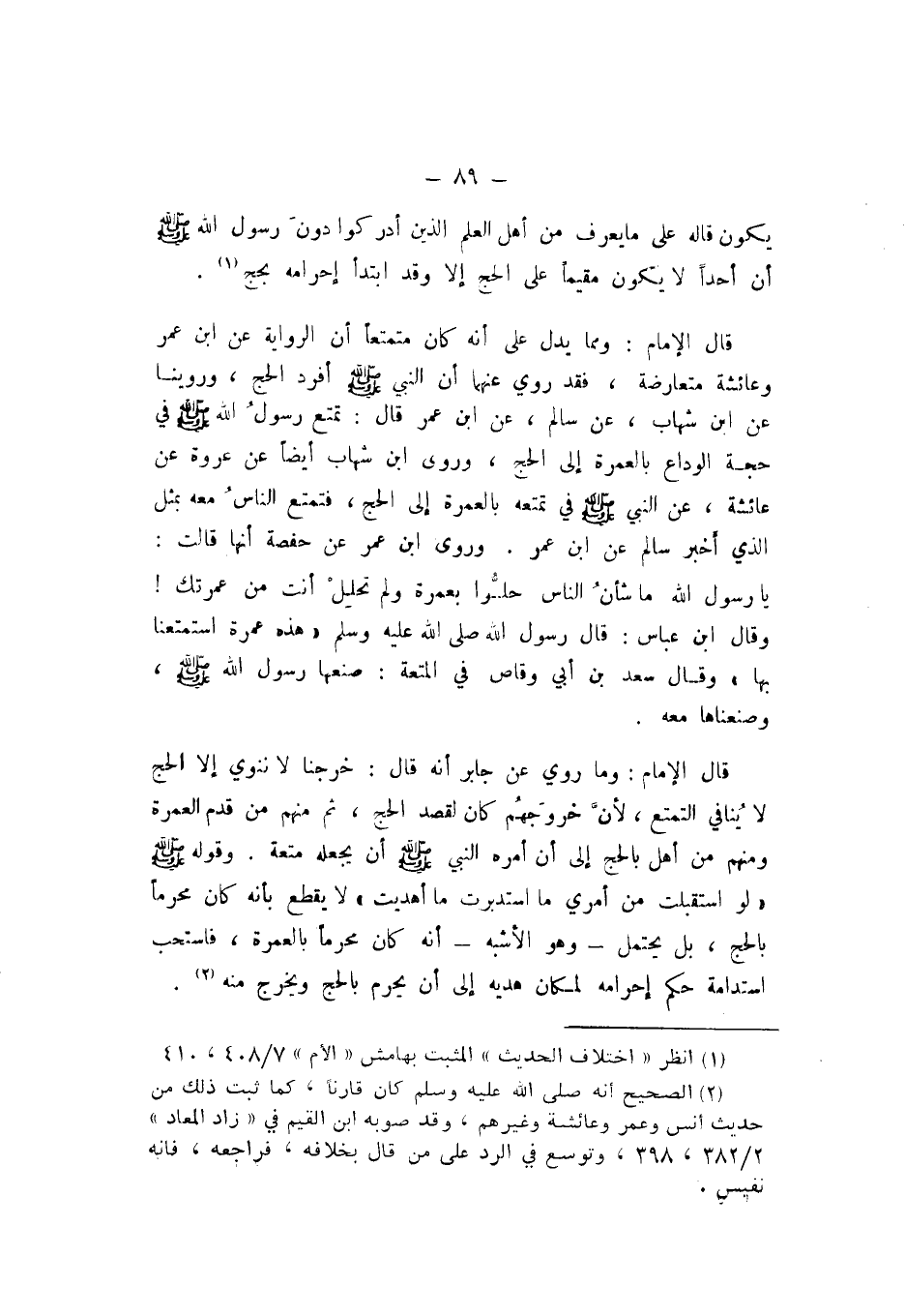 قَالَ الإِمَامُ: وَمِمَّا يَدُلُّ عَلَى أَنَّهُ كَانَ مُتَمَتِّعًا، أَنَّ الرِّوَايَةَ عَنِ ابْنِ عُمَرَ، وَعَائِشَةَ مُتَعَارِضَةٌ، فَقَدْ رُوِيَ عَنْهُمَا، أَنَّ النَّبِيَّ صَلَّى اللهُ عَلَيْهِ وَسَلَّمَ أَفْرَدَ الْحَجَّ، وَرَوَيْنَا عَنِ ابْنِ شِهَابٍ، عَنْ سَالِمٍ، عَنِ ابْنِ عُمَرَ، قَالَ: تَمَتَّعَ رَسُولُ اللَّهِ صَلَّى اللهُ عَلَيْهِ وَسَلَّمَ فِي حَجَّةِ الْوَدَاعِ بِالْعُمْرَةِ إِلَى الْحَجِّ، وَرَوَى ابْنُ شِهَابٍ أَيْضًا عَنْ عُرْوَةَ، عَنْ عَائِشَةَ، عَنِ النَّبِيِّ صَلَّى اللهُ عَلَيْهِ وَسَلَّمَ فِي تَمَتُّعِهِ بِالْعُمْرَةِ إِلَى الْحَجِّ، فَتَمَتَّعَ النَّاسُ مَعَهُ بِمِثْلِ الَّذِي أَخْبَرَ سَالِمٌ، عَنِ ابْنِ عُمَرَ.