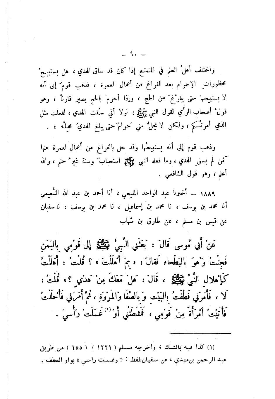 1889 - أَخْبَرَنَا عَبْدُ الْوَاحِدِ الْمَلِيحِيُّ، أَنَا أَحْمَدُ بْنُ عَبْدِ اللَّهِ النُّعَيْمِيُّ، أَنَا مُحَمَّدُ بْنُ يُوسُفَ، نَا مُحَمَّدُ بْنُ إِسْمَاعِيلَ، نَا مُحَمَّدُ بْنُ يُوسُفَ، نَا سُفْيَانُ، عَنْ قَيْسِ بْنِ مُسْلِمٍ، عَنْ طَارِقِ بْنِ شِهَابٍ، عَنْ أَبِي مُوسَى، قَالَ: بَعَثَنِي النَّبِيُّ صَلَّى اللهُ عَلَيْهِ وَسَلَّمَ إِلَى قَوْمِي بِالْيَمَنِ، فَجِئْتُ وَهُوَ بِالْبَطْحَاءِ، فَقَالَ: «بِمَ أَهْلَلْتَ؟»، قُلْتُ: أَهْلَلْتُ كَإِهْلالِ النَّبِيِّ صَلَّى اللهُ عَلَيْهِ وَسَلَّمَ، قَالَ: «هَلْ مَعَكَ مِنْ هَدْيٍ؟»، قُلْتُ: لَا، فَأَمَرَنِي، فَطُفْتُ بِالْبَيْتِ، وَبِالصَّفَا وَالْمَرْوَةِ، ثُمَّ أَمَرَنِي فَأَحْلَلْتُ فَأَتَيْتُ امْرَأَةً مِنْ قَوْمِي، فَمَشَّطَتْنِي، أَوْ غَسَلَتْ رَأْسِي.
