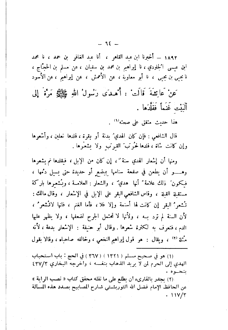 1892 - أَخْبَرَنَا ابْنُ عَبْدِ الْقَاهِرِ، أَنا عَبْدُ الْغَافِرِ بْنُ مُحَمَّدٍ، نَا مُحَمَّدُ بْنُ عِيسَى الْجُلُودِيُّ، نَا إِبْرَاهِيمُ بْنُ مُحَمَّدِ بْنِ سُفْيَانَ، عَنْ مُسْلِمِ بْنِ الْحَجَّاجِ، نَا يَحْيَى بْنُ يَحْيَى، نَا أَبُو مُعَاوِيَةَ، عَنِ الْأَعْمَشِ، عَنْ إِبْرَاهِيمَ، عَنِ الْأَسْوَدِ، عَنْ عَائِشَةَ، قَالَتْ: «أَهْدَى رَسُولُ اللَّهِ صَلَّى اللهُ عَلَيْهِ وَسَلَّمَ مَرَّةً إِلَى الْبَيْتِ غَنَمًا، فَقَلَّدَهَا».