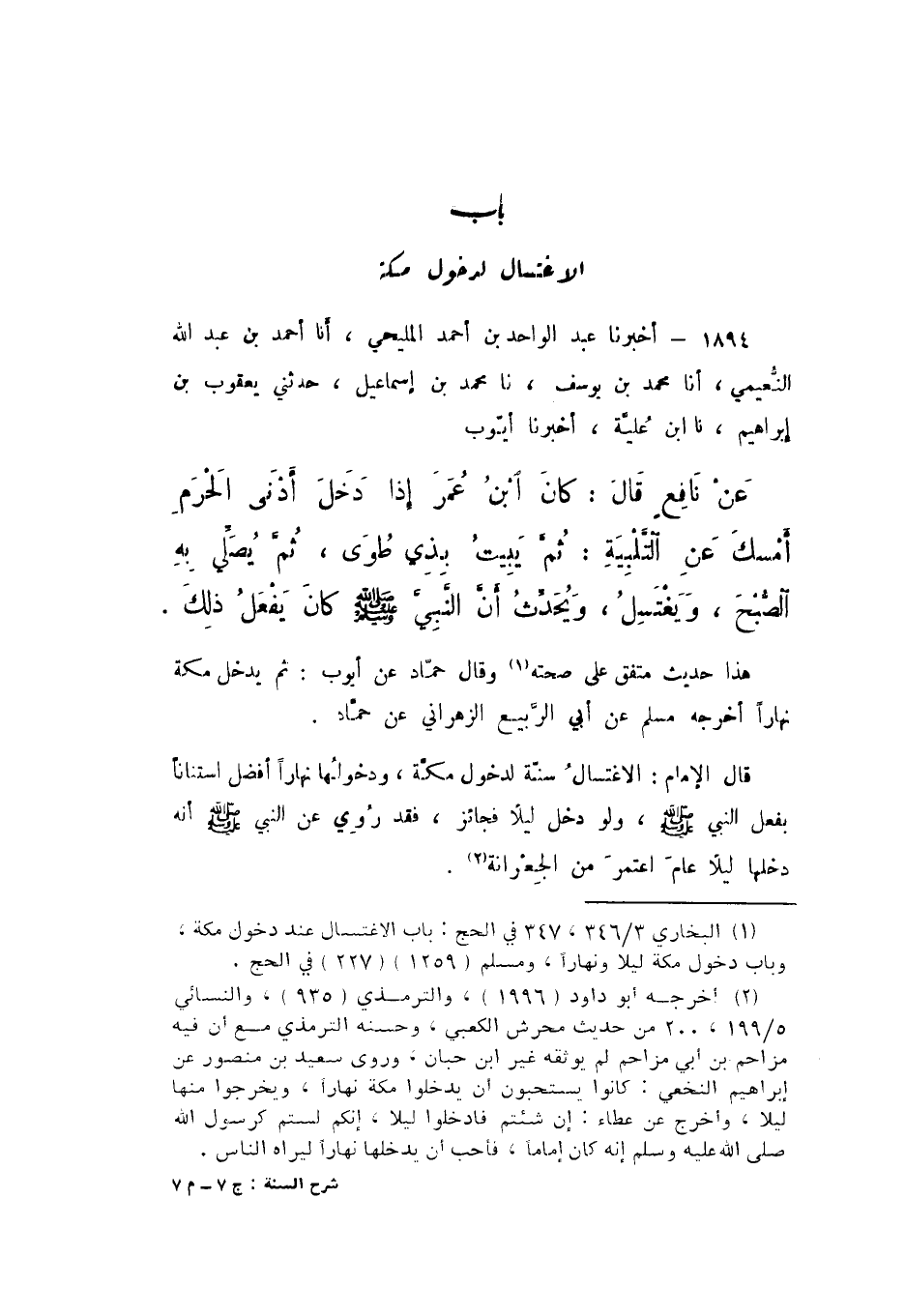 1894 - أَخْبَرَنَا عَبْدُ الْوَاحِدِ بْنُ أَحْمَدَ الْمَلِيحِيُّ، أَنا أَحْمَدُ بْنُ عَبْدِ اللَّهِ النُّعَيْمِيُّ، أَنا مُحَمَّدُ بْنُ يُوسُفَ، نَا مُحَمَّدُ بْنُ إِسْمَاعِيلَ، حَدَّثَنِي يَعْقُوبُ بْنُ إِبْرَاهِيمَ، نَا ابْنُ عُلَيَّةَ، نَا أَيُّوبُ، عَنْ نَافِعٍ، قَالَ: «كَانَ ابْنُ عُمَرَ إِذَا دَخَلَ أَدْنَى الْحَرَمِ، أَمْسَكَ عَنِ التَّلْبِيَةِ، ثُمَّ يَبِيتُ بِذِي طُوًى، ثُمَّ يُصَلِّي بِهِ الصُّبْحَ، وَيَغْتَسِلُ، وَيُحَدِّثُ أَنَّ النَّبِيَّ صَلَّى اللهُ عَلَيْهِ وَسَلَّمَ كَانَ يَفْعَلُ ذَلِكَ».