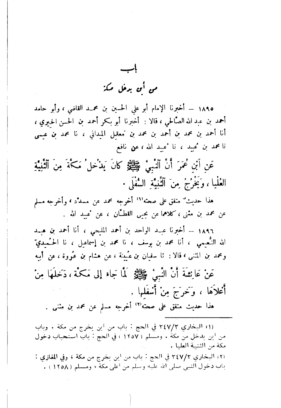 1895 - أَخْبَرَنَا الإِمَامُ أَبُو عَلِيٍّ الْحُسَيْنُ بْنُ مُحَمَّدٍ الْقَاضِي، وَأَبُو حَامِدٍ أَحْمَدُ بْنُ عَبْدِ اللَّهِ الصَّالِحِيُّ، قَالا: أَخْبَرَنَا أَبُو بَكْرٍ أَحْمَدُ بْنُ الْحَسَنِ الْحِيرِيُّ، أَنا أَحْمَدُ بْنُ مُحَمَّدِ بْنِ أَحْمَدَ بْنِ مُحَمَّدِ بْنِ مَعْقَلٍ الْمَيْدَانِيُّ، نَا مُحَمَّدُ بْنُ عِيسَى، نَا مُحَمَّدُ بْنُ عُبَيْدٍ، نَا عُبَيْدُ اللَّهِ، عَنْ نَافِعٍ، عَنِ ابْنِ عُمَرَ، أَنّ النَّبيَّ صَلَّى اللهُ عَلَيْهِ وَسَلَّمَ، كَانَ يَدْخُلُ مَكَّةَ مِنَ الثَّنِيَّةِ الْعُلْيَا، وَيَخْرُجُ مِنَ الثَّنِيَّةِ السُّفْلَى.