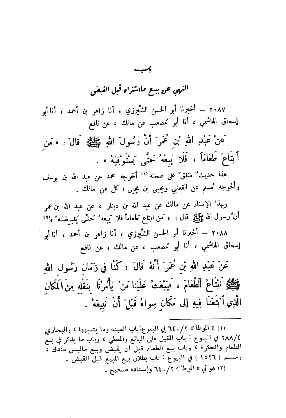 2087 - أَخْبَرَنَا أَبُو الْحَسَنِ الشِّيرَزِيُّ، أَنا زَاهِرُ بْنُ أَحْمَدَ، أَنا أَبُو إِسْحَاقَ الْهَاشِمِيُّ، أَنا أَبُو مُصْعَبٍ، عَنْ مَالِكٍ، عَنْ نَافِعٍ، عَنْ عَبْدِ اللَّهِ بْنِ عُمَرَ، أَنّ رَسُولَ اللَّهِ صَلَّى اللهُ عَلَيْهِ وَسَلَّمَ قَالَ: «مَنِ ابْتَاعَ طَعَامًا، فَلا يَبِعْهُ حَتَّى يَسْتَوْفِيَهُ».