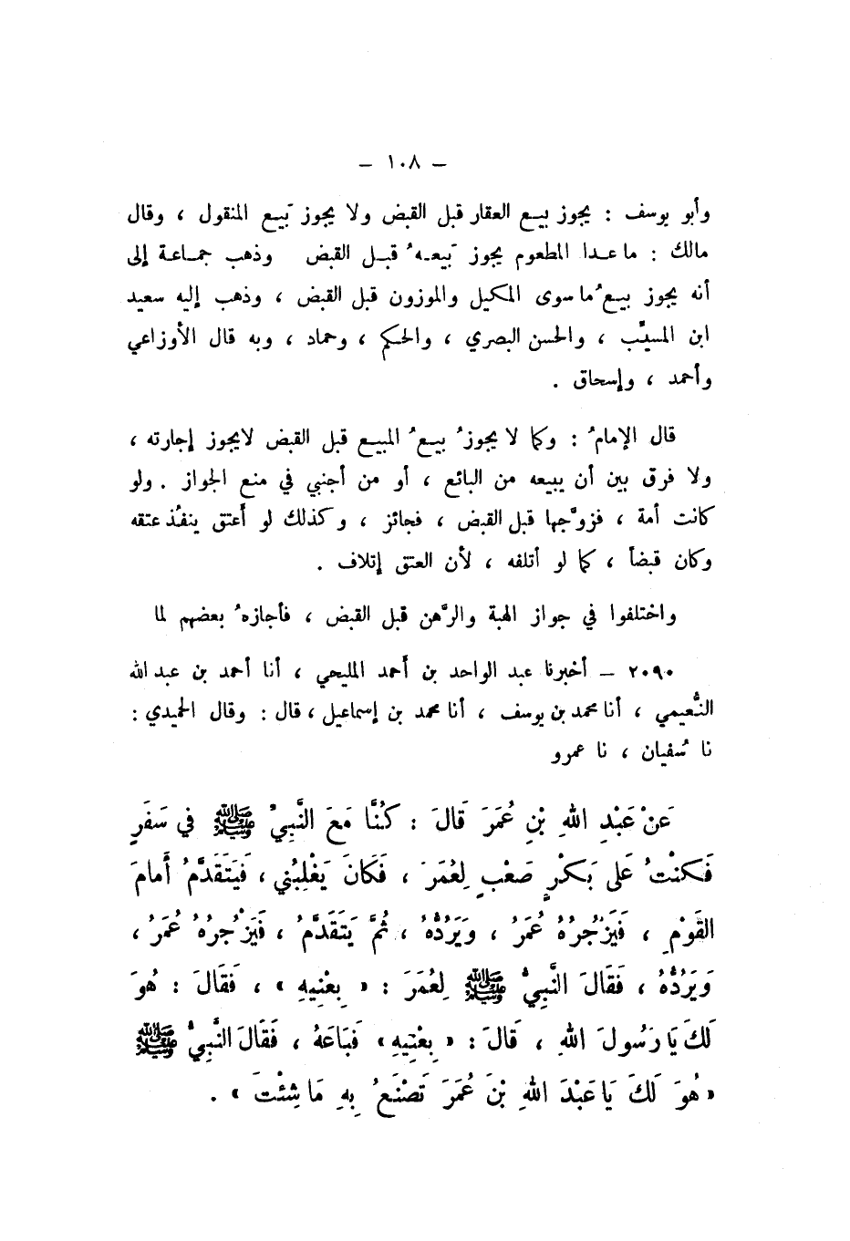 2090 - أَخْبَرَنَا عَبْدُ الْوَاحِدِ بْنُ أَحْمَدَ الْمَلِيحِيُّ، أَنا أَحْمَدُ بْنُ عَبْدِ اللَّهِ النُّعَيْمِيُّ، أَنا مُحَمَّدُ بْنُ يُوسُفَ، أَنا مُحَمَّدُ بْنُ إِسْمَاعِيلَ، قَالَ: وَقَالَ الْحُمَيْدِيُّ نَا سُفْيَانُ، نَا عَمْرٌو، عَنْ عَبْدِ اللَّهِ بْنِ عُمَرَ، قَالَ: " كُنَّا مَعَ النَّبِيِّ صَلَّى اللهُ عَلَيْهِ وَسَلَّمَ فِي سَفَرٍ، فَكُنْتُ عَلَى بَكْرٍ صَعْبٍ لِعُمَرَ، فَكَانَ يَغْلِبُنِي، فَيَتَقَدَّمُ أَمَامَ الْقَوْمِ، فَيَزْجُرُهُ عُمَرُ وَيَرُدُّهُ، ثُمَّ يَتَقَدَّمُ، فَيَزْجُرُهُ عُمَرُ وَيَرُدُّهُ، فَقَالَ النَّبِيُّ صَلَّى اللهُ عَلَيْهِ وَسَلَّمَ لِعُمَرَ: بِعْنِيهِ.