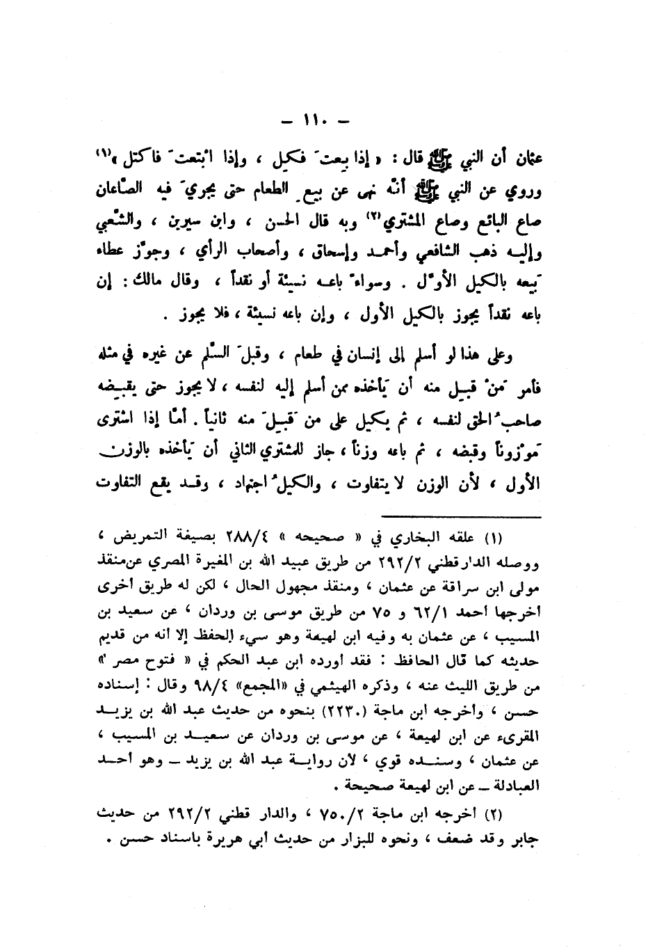 وَرُوِيَ عَنِ النَّبِيِّ صَلَّى اللهُ عَلَيْهِ وَسَلَّمَ «أَنَّهُ نَهَى عَنْ بَيْعِ الطَّعَامِ حَتَّى يَجْرِيَ فِيهِ الصَّاعَانِ صَاعُ الْبَائِعِ وَصَاعُ الْمُشْتَرِي»، وَبِهِ قَالَ الْحَسَنُ، وَابْنُ سِيرِينَ، وَالشَّعْبِيُّ، وَإِلَيْهِ ذَهَبَ الشَّافِعِيُّ، وَأَحْمَدُ، وَإِسْحَاقُ، وَأَصْحَابُ الرَّأْيِ.