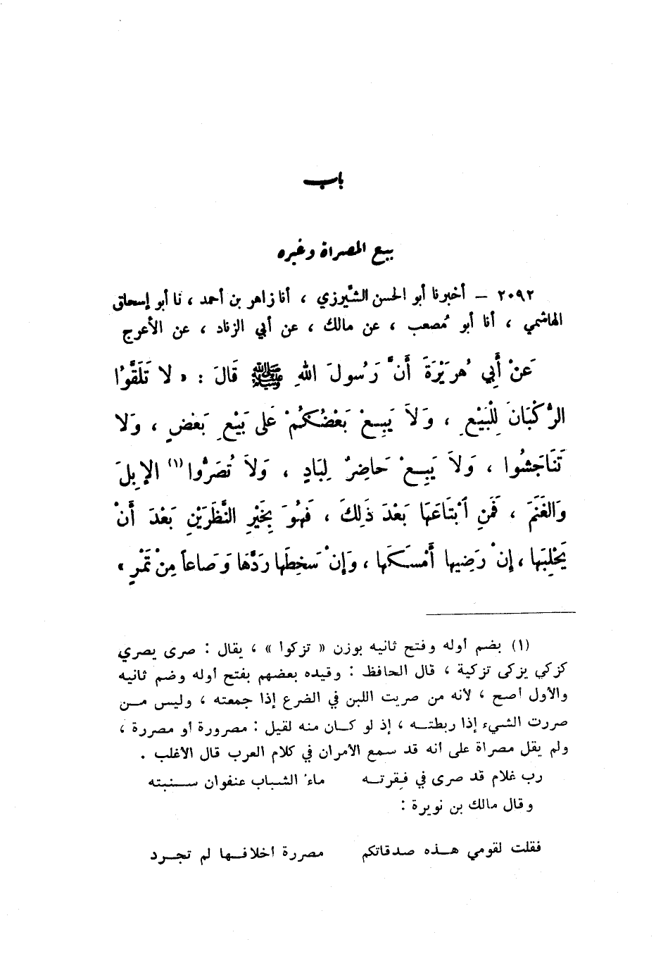2092 - أَخْبَرَنَا أَبُو الْحَسَنِ الشِّيرَزِيُّ، أنَا زَاهِرُ بْنُ أَحْمَدَ، نَا أَبُو إِسْحَاقَ الْهَاشِمِيُّ، نَا أَبُو مُصْعَبٍ، عَنْ مَالِكٍ، عَنْ أَبِي الزِّنَادِ، عَنِ الأَعْرَجِ، عَنْ أَبي هُرَيْرَةَ أَنَّ رَسُولَ اللَّهِ صَلَّى اللهُ عَلَيْهِ وَسَلَّمَ قَالَ: «لَا تَلَقَّوُا الرُّكْبَانَ لِلْبَيْعِ، وَلا يَبِعْ بَعْضُكُمْ عَلَى بَيْعِ بَعْضٍ، وَلا تَنَاجَشُوا، وَلا يَبِعْ حَاضِرٌ لِبَادٍ، وَلا تَصَرُّوا الإِبِلَ وَالْغَنَمَ، فَمَنِ ابْتَاعَهَا بَعْدَ ذَلِكَ، فَهُوَ بِخَيْرِ النَّظَرَيْنِ بَعْدَ أَنْ يَحْلِبَهَا، إِنْ رَضِيَهَا أَمْسَكَهَا، وَإِنْ سَخِطَهَا رَدَّهَا وَصَاعًا مِنْ تَمْرٍ».