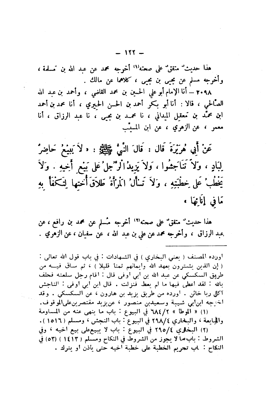 2098 - أَنا الإِمَامُ أَبُو عَلِيٍّ الْحُسَيْنُ بْنُ مُحَمَّدٍ الْقَاضِي، وَأَحْمَدُ بْنُ عَبْدِ اللَّهِ الصَّالِحِيُّ، قَالا: أَنا أَبُو بَكْرٍ أَحْمَدُ بْنُ الْحَسَنِ الْحِيرِيُّ، أَنا مُحَمَّدُ بْنُ أَحْمَدَ بْنِ مُحَمَّدِ بْنِ مَعْقِلٍ الْمَيْدَانِيُّ، نَا مُحَمَّدُ بْنُ يَحْيَى، نَا عَبْدُ الرَّزَّاقِ، أَنا مَعْمَرٌ، عَنِ الزُّهْرِيِّ، عَنِ ابْنِ الْمُسَيِّبِ، عَنْ أَبي هُرَيْرَةَ قَالَ: قَالَ النَّبِيُّ صَلَّى اللهُ عَلَيْهِ وَسَلَّمَ: «لَا يَبِيعُ حَاضِرٌ لِبَادٍ، وَلا تَنَاجَشُوا، وَلا يَزيدُ الرَّجُلُ عَلَى بَيْعِ أَخِيهِ، وَلا يَخْطُبُ عَلَى خِطْبَتِهِ، وَلا تَسْأَلُ الْمَرْأَةُ طَلاقَ أُختِها لِتكْفأَ بِهِ مَا فِي إِنَائِهَا».