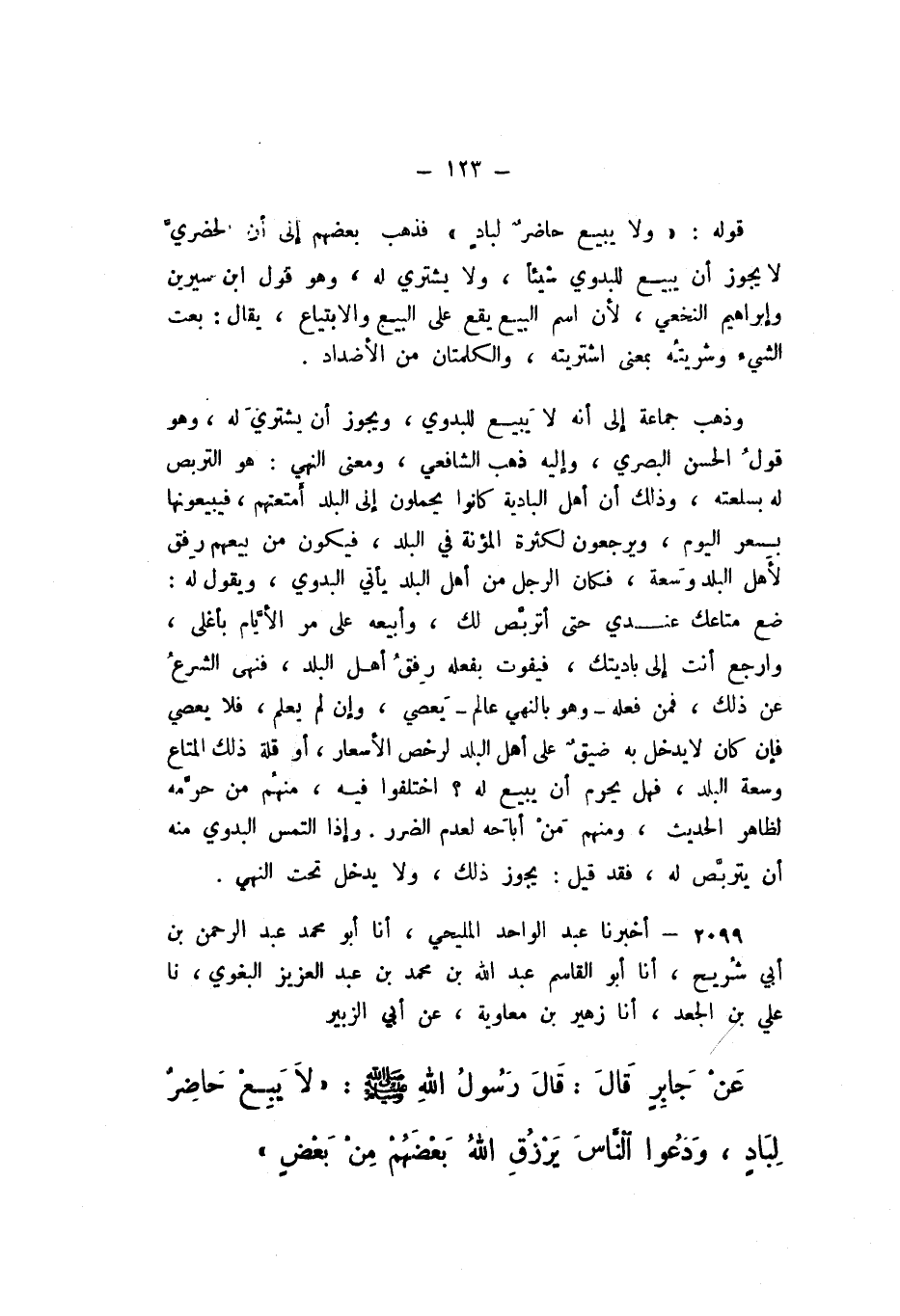 2099 - أَخْبَرَنَا عَبْدُ الْوَاحِدِ الْمَلِيحِيُّ، أَنا أَبُو مُحَمَّدٍ عَبْدُ الرَّحْمَنِ بْنُ أَبِي شُرَيْحٍ، أَنا أَبُو الْقَاسِمِ عَبْدُ اللَّهِ بْنُ مُحَمَّدِ بْنِ عَبْدِ الْعَزِيزِ الْبَغَوِيُّ، نَا عَلِيُّ بْنُ الْجَعْدِ، أَنا زُهَيْرُ بْنُ مُعَاوِيَةَ، عَنْ أَبِي الزُّبَيْرِ، عَنْ جَابِرٍ، قَالَ: قَالَ رَسُولُ اللَّهِ صَلَّى اللهُ عَلَيْهِ وَسَلَّمَ: «لَا يَبِعْ حَاضِرٌ لِبَادٍ، وَدَعُوا النَّاسَ يَرْزُقِ اللَّهُ بَعْضَهُمْ مِنْ بَعْضٍ».