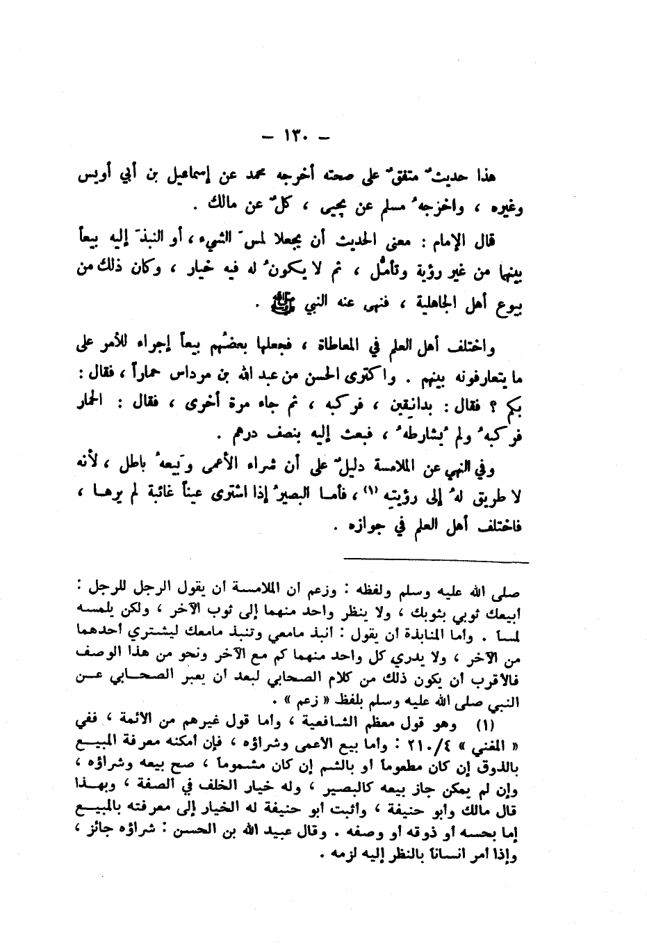 قَالَ الإِمَامُ: مَعْنَى الْحَدِيثِ أَنْ يَجْعَلا لَمْسَ الشَّيْءِ أَوِ النَّبْذَ إِلَيْهِ بَيْعًا بَيْنَهُمَا، مِنْ غَيْرِ رُؤْيَةٍ وَتَأَمُّلٍ، ثُمَّ لَا يَكُونُ لَهُ فِيهِ خِيَارٌ، وَكَانَ ذَلِكَ مِنْ بِيُوعِ أَهْلِ الْجَاهِلِيَّةِ، فَنَهَى عَنْهُ النَّبِيُّ صَلَّى اللهُ عَلَيْهِ وَسَلَّمَ.