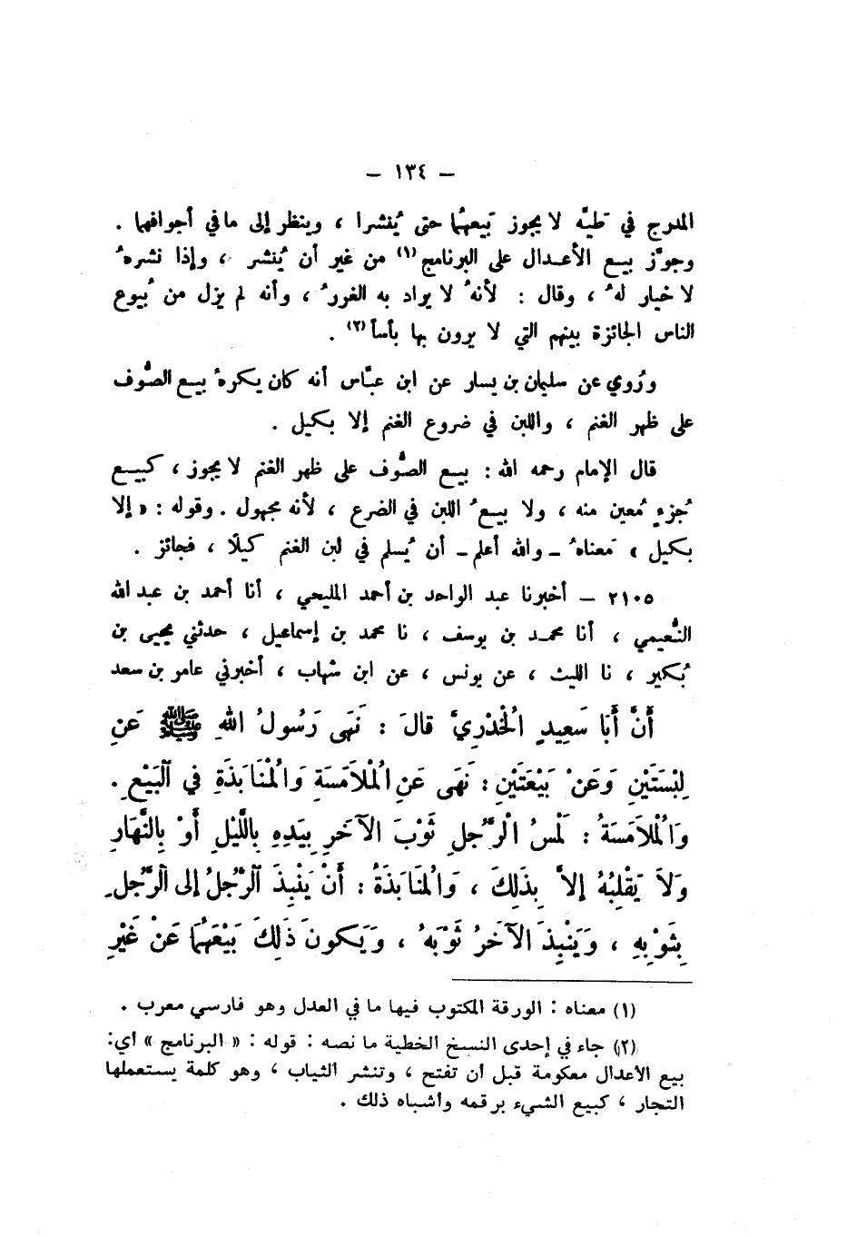 2105 - أَخْبَرَنَا عَبْدُ الْوَاحِدِ بْنُ أَحْمَدَ الْمَلِيحِيُّ، أَنا أَحْمَدُ بْنُ عَبْدِ اللَّهِ النُّعَيْمِيُّ، أَنا مُحَمَّدُ بْنُ يُوسُفَ، نَا مُحَمَّدُ بْنُ إِسْمَاعِيلَ، حَدَّثَنِي يَحْيَى بْنُ بُكَيْرٍ، نَا اللَّيْثُ، عَنْ يُونُسَ، عَنِ ابْنِ شِهَابٍ، أَخْبَرَنِي عَامِرُ بْنُ سَعْدٍ، أَنَّ أبَا سَعِيدٍ الْخُدْرِيَّ، قَالَ: " نَهَى رَسُولُ اللَّهِ صَلَّى اللهُ عَلَيْهِ وَسَلَّمَ عَنْ لبْسَتَيْنِ وَعَنْ بَيْعَتَيْنِ: نَهَى عَنِ الْمُلامَسَةِ وَالمُنَابَذَةِ فِي البَيْعِ.