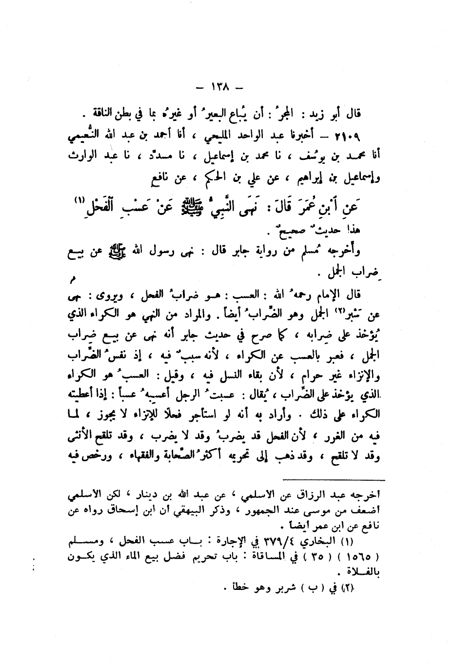 قَالَ الإِمَامُ رَحِمَهُ اللَّهُ: الْعَسْبُ هُوَ ضِرَابُ الْفَحْلِ، وَيُرْوَى: «نَهَى عَنْ شَبْرِ الْجَمَلِ»، وَهُوَ الضِّرَابُ أَيْضًا.