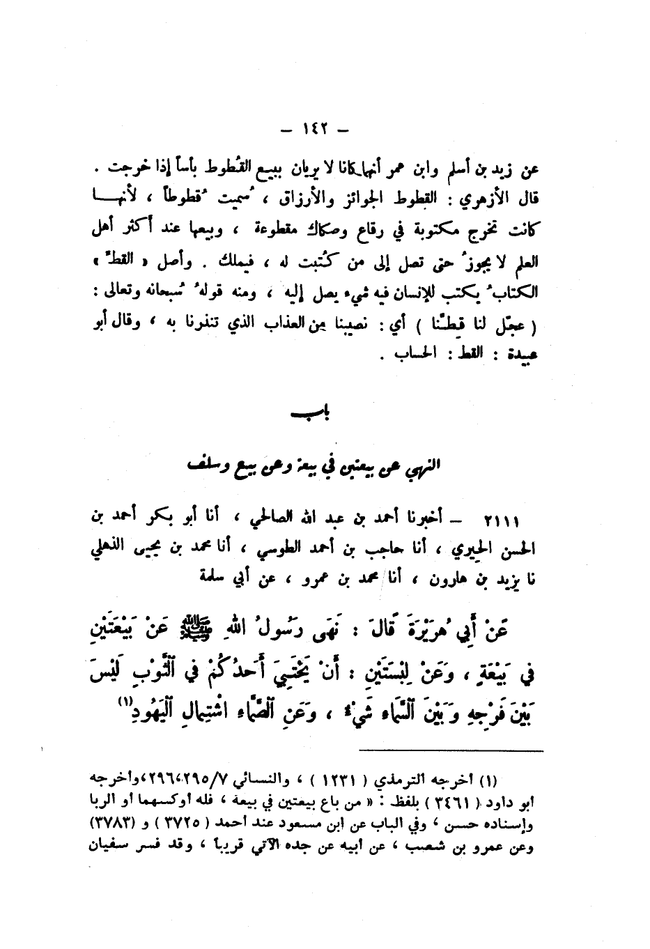 2111 - أَخْبَرَنَا أَحْمَدُ بْنُ عَبْدِ اللَّهِ الصَّالِحِيُّ، أَنا أَبُو بَكْرٍ أَحْمَدُ بْنُ الْحَسَنِ الْحِيرِيُّ، أَنا حَاجِبُ بْنُ أَحْمَدَ الطُّوسِيُّ، أَنا مُحَمَّدُ بْنُ يَحْيَى الذُّهْلِيُّ، نَا يَزِيدُ بْنُ هَارُونَ، أَنا مُحَمَّدُ بْنُ عَمْرٍو، عَنْ أَبِي سَلَمَةَ، عَنْ أَبي هُرَيْرَةَ قَالَ: " نَهَى رَسُولُ اللَّهِ صَلَّى اللهُ عَلَيْهِ وَسَلَّمَ عَنْ بَيْعَتَيْنِ فِي بَيْعَةٍ، وَعَنْ لبْسَتَيْنِ: أَنْ يَخْتَبِيَ أَحَدُكُمْ فِي الثَّوْبِ لَيْسَ بَيْنَ فَرْجِهِ وَبَيْنَ السَّمَاءِ شَيْءٌ، وَعَنِ الصَّمَّاءِ اشْتِمالِ الْيَهُودِ ".