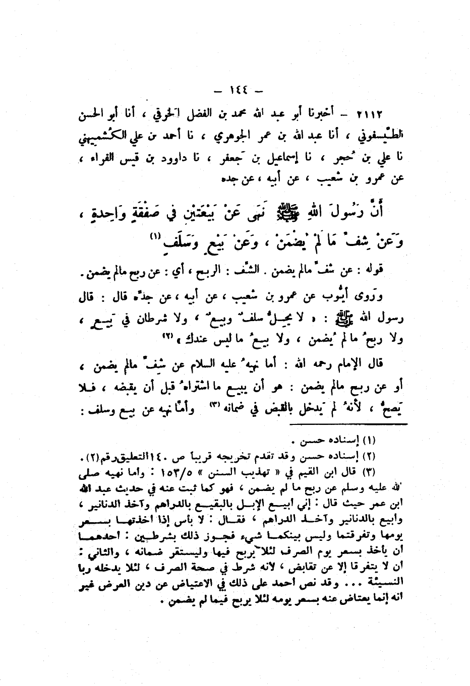 2112 - أَخْبَرَنَا أَبُو عَبْد اللَّهِ مُحَمَّدُ بْنُ الْفَضْلِ الْخِرَقِيُّ، أَنا أَبُو الْحَسَنِ الطَّيْسَفُونِيُّ، أَنا عَبْدُ اللَّهِ بْنُ عُمَرَ الْجَوْهَرِيُّ، نَا أَحْمَدُ بْنُ عَلِيٍّ الْكُشْمِيهَنِيُّ، نَا عَلِيُّ بْنُ حُجْرٍ، نَا إِسْمَاعِيلُ بْنُ جَعْفَرٍ، نَا دَاوُدُ بْنُ قَيْسٍ الْفَرَّاءُ، عَنْ عَمْرِو بْنِ شُعَيْبٍ، عَنْ أَبِيهِ، عَنْ جَدِّهِ، «أَنَّ رَسُولَ اللَّهِ صَلَّى اللهُ عَلَيْهِ وَسَلَّمَ نَهَى عَنْ بَيْعَتَيْنِ فِي صَفْقَةٍ وَاحِدَةٍ، وَعَنْ شِفِّ مَا لَمْ يُضْمَنُ، وَعَنْ بَيْعٍ وَسَلَفٍ».